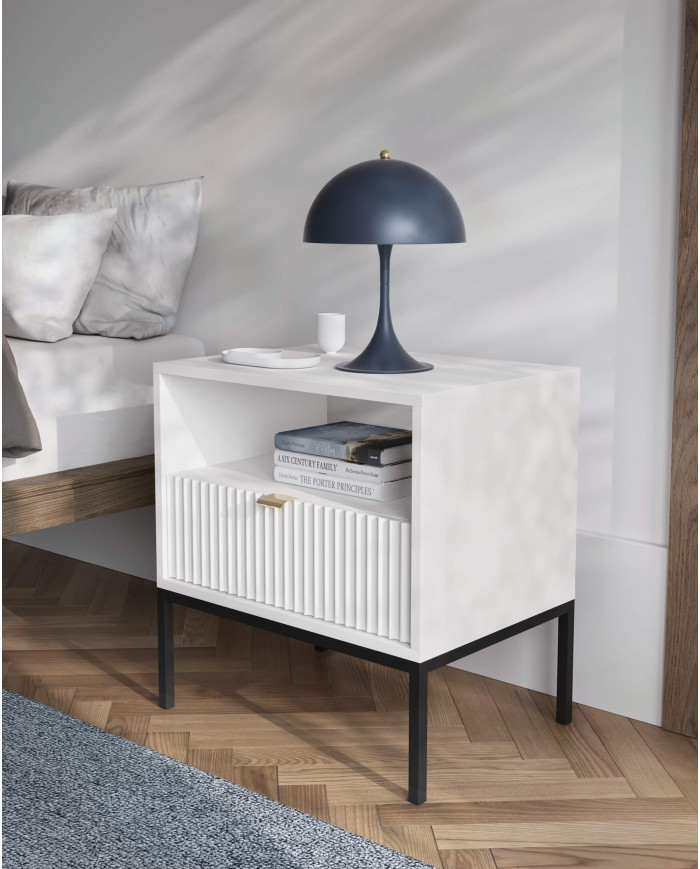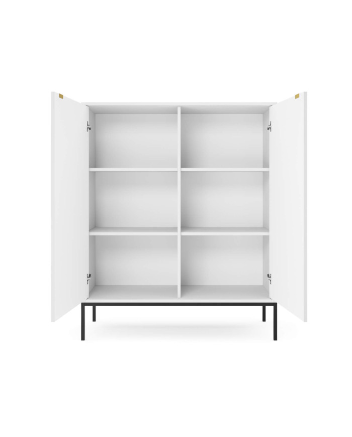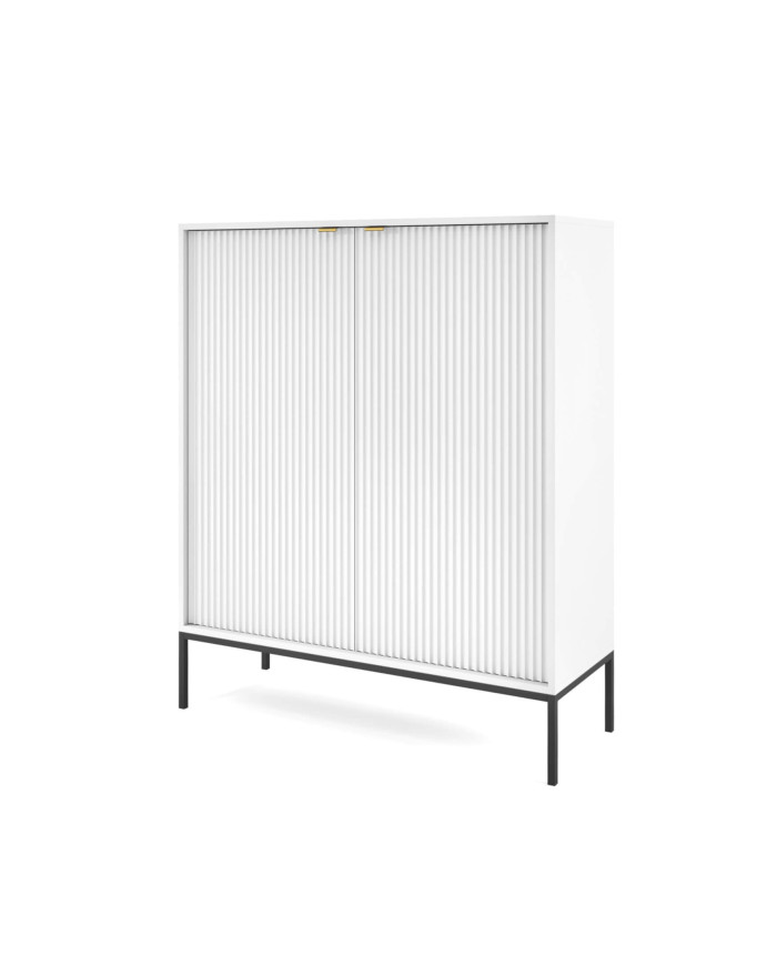 Unikali komoda „Nova KSZ104“ puikiai dera tiek prie modernių, tiek prie klasikinio stiliaus erdvių. Ji puikiai tiks tiek prie modernių, tiek prie klasikinio stiliaus erdvių, suteikdama baldui prestižo ir harmoningų formų. Baldų fasadai ir korpusas yra baltos spalvos, o rėmas ir kojelės – juodos. Komplekte yra keturios varstomos durys, už kurių yra horizontalios lentynos. Spintelių fasadus puošia prestižinės auksinės rankenėlės, išdėstytos ant griovelių MDF plokštės, pabrėžiančios kolekcijos charakterį. Komoda pagaminta iš laminuotos baldų plokštės, pasižyminčios padidintu atsparumu įbrėžimams. Aukštos kojelės (20 cm) leidžia naudoti valymo robotus. Spintelė priklauso to paties pavadinimo baldų linijai, kurią sudaro komodos, naktinis staliukas, kavos staliukas ir televizoriaus staliukas. Baldas pristatomas išardytas su aiškiomis surinkimo instrukcijomis. Komoda taip pat gali būti su juodu pagrindu ir kojelėmis.