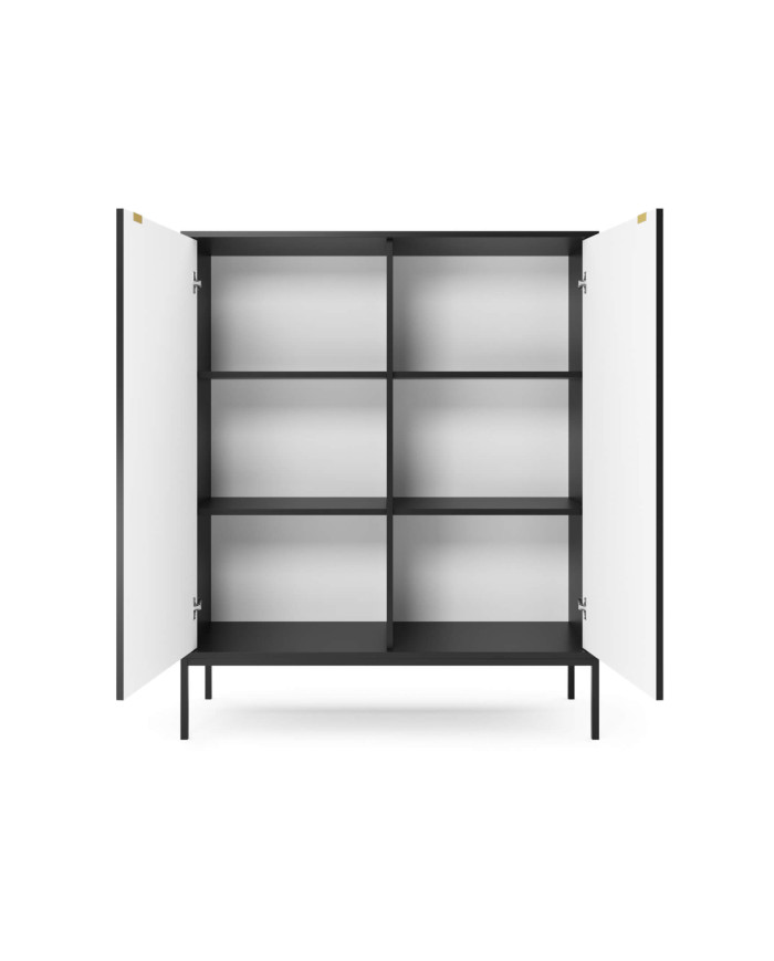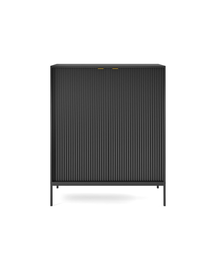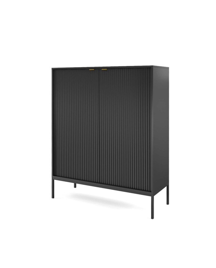 Unikali komoda „Nova KSZ104“ su grioveliais iš juodo MDF fasado puikiai dera prie šiuolaikinių svetainių ir darbo erdvių. Ji puikiai derės tiek prie modernių, tiek prie klasikinio stiliaus erdvių, suteikdama prestižo ir harmoningų formų. Komplektą sudaro keturios varstomos durys, už kurių slypi horizontalios lentynos. Aukštos juodos kojelės (20 cm) yra spintelės apačioje. Spintelių fasadai puošti prestižinėmis auksinėmis rankenėlėmis, pabrėžiančiomis kolekcijos charakterį. Komoda pagaminta iš laminuotos baldinės plokštės, kuri pasižymi padidintu atsparumu įbrėžimams. Aukštos kojelės leidžia naudoti valymo robotus. Spintelė priklauso to paties pavadinimo baldų linijai, kurią sudaro komodos, naktinis staliukas, kavos staliukas ir televizoriaus staliukas. Spintelė pristatoma išardyta su aiškiomis surinkimo instrukcijomis. Komoda taip pat gali būti su auksiniu pagrindu ir kojelėmis.
