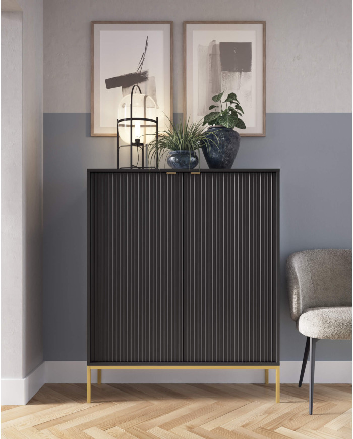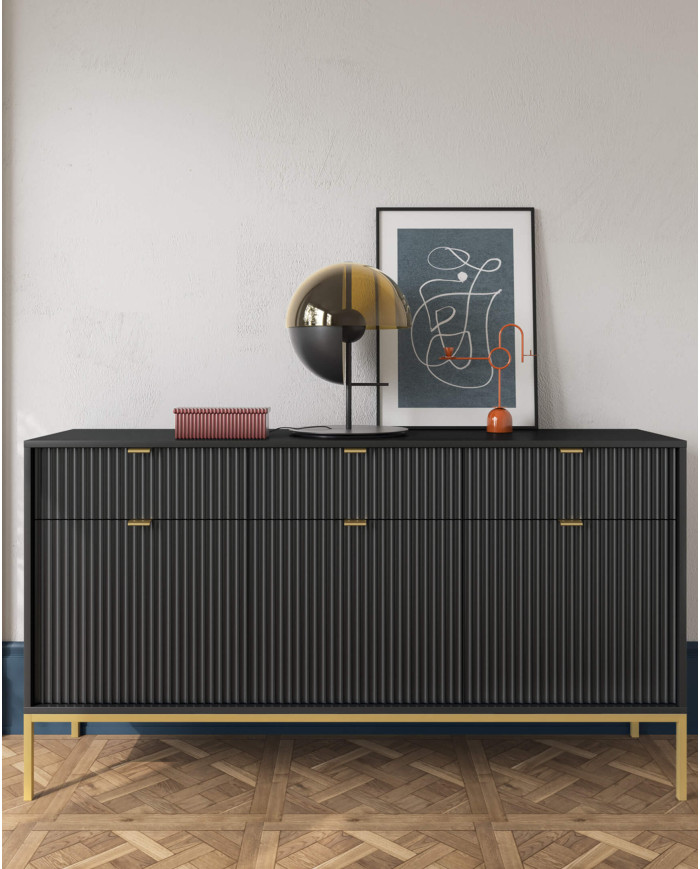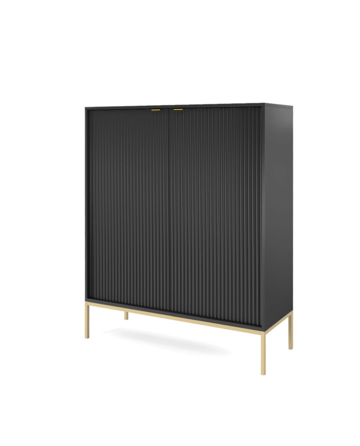Unikali komoda „Nova KSZ104“ su grioveliais iš juodo MDF fasado puikiai dera prie šiuolaikinių svetainių ir darbo erdvių. Ji puikiai derės tiek prie modernių, tiek prie klasikinio stiliaus erdvių, suteikdama prestižo ir harmoningų formų. Komplektą sudaro keturios varstomos durys, už kurių slypi horizontalios lentynos. Apatinėje dalyje yra aukštos auksinės kojelės (20 cm) su metaliniu pagrindu. Spintelių fasadai puošti prestižinėmis auksinėmis rankenėlėmis, pabrėžiančiomis kolekcijos charakterį. Komoda pagaminta iš laminuotos baldinės plokštės, kuri pasižymi padidintu atsparumu įbrėžimams. Aukštos kojelės leidžia naudoti valymo robotus. Spintelė priklauso to paties pavadinimo baldų linijai, kurią sudaro komodos, naktinis staliukas, kavos staliukas ir televizoriaus staliukas. Spintelė pristatoma išardyta su aiškiomis surinkimo instrukcijomis. Komoda taip pat gali būti su juodu pagrindu ir kojelėmis.