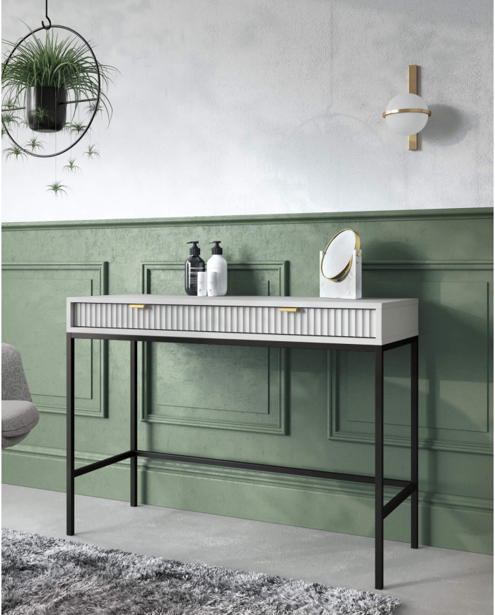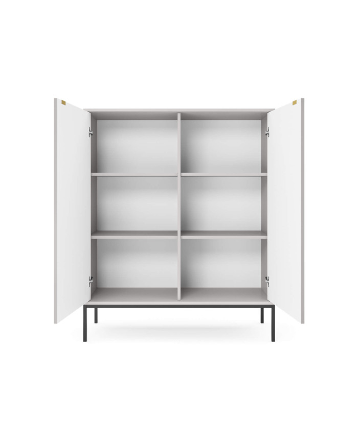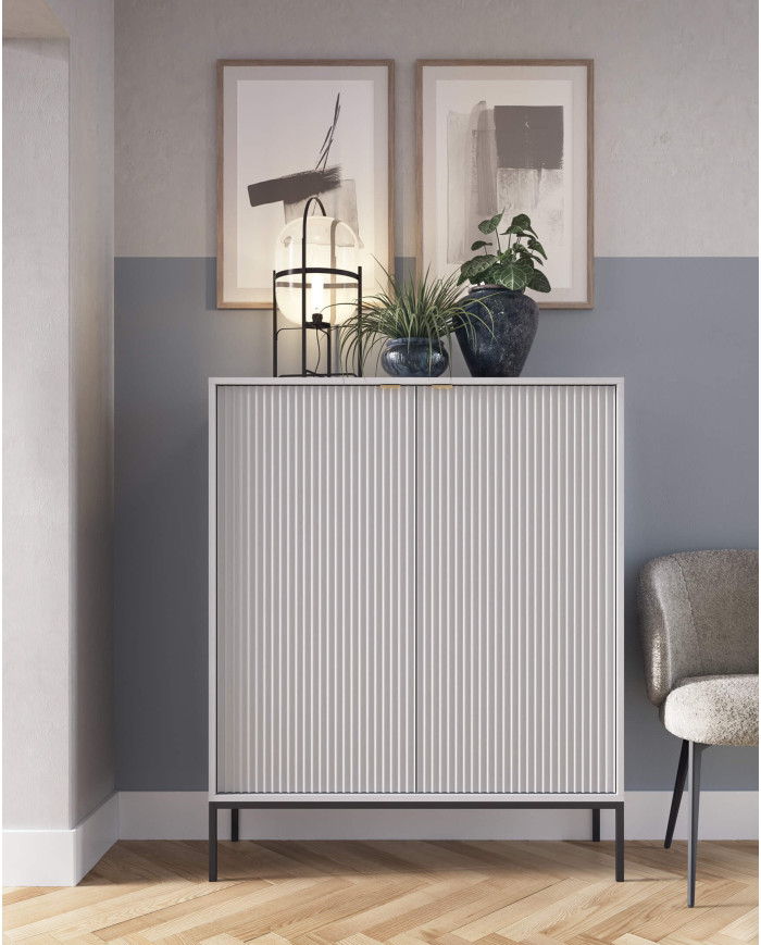 Komoda „Nova KSZ104“ su grioveliais, pilku MDF priekiu yra puikus baldų pasirinkimas šiuolaikinėms svetainėms ir darbo erdvėms. Ji puikiai derės tiek moderniose, tiek klasikinio stiliaus erdvėse, suteikdama prestižo ir harmoningų formų. Komplektą sudaro keturios varstomos durys, už kurių slypi horizontalios lentynos. Apatinėje dalyje yra aukštos, juodos metalinės kojelės (20 cm) su metaliniu pagrindu. Spintelių fasadai puošti patraukliomis auksinėmis rankenėlėmis, pabrėžiančiomis kolekcijos charakterį. Komoda pagaminta iš laminuotos baldinės plokštės, kuri pasižymi padidintu atsparumu įbrėžimams. Aukštos kojelės leidžia naudoti valymo robotus, kad spintelės apačia būtų švari. Spintelė priklauso to paties pavadinimo kolekcijai, kurią sudaro komodos, naktinis staliukas, kavos staliukas ir televizoriaus staliukas. Komoda taip pat gali būti su auksiniu pagrindu ir kojelėmis. Komoda „Nova“ pristatoma iš anksto supakuota su aiškiomis surinkimo instrukcijomis.
