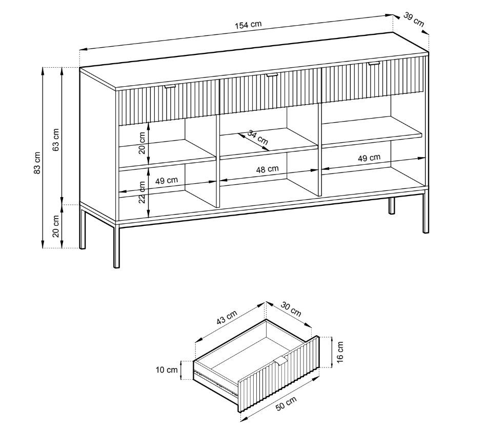 Balta komoda „Nova KSZ-154“ – turi tris spinteles su lentynomis už fasadų ir tris stalčius.