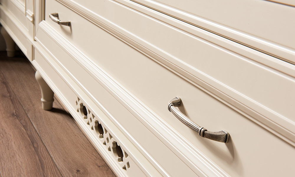 Kolekcija siūloma dviejų korpuso spalvų – vanilės ir kašmyro su patina, o viršus padengtas tamsesnės spalvos natūraliu ąžuolo lukštu. Korpuso medžiaga: dažyta/laminuota MDF plokštė.