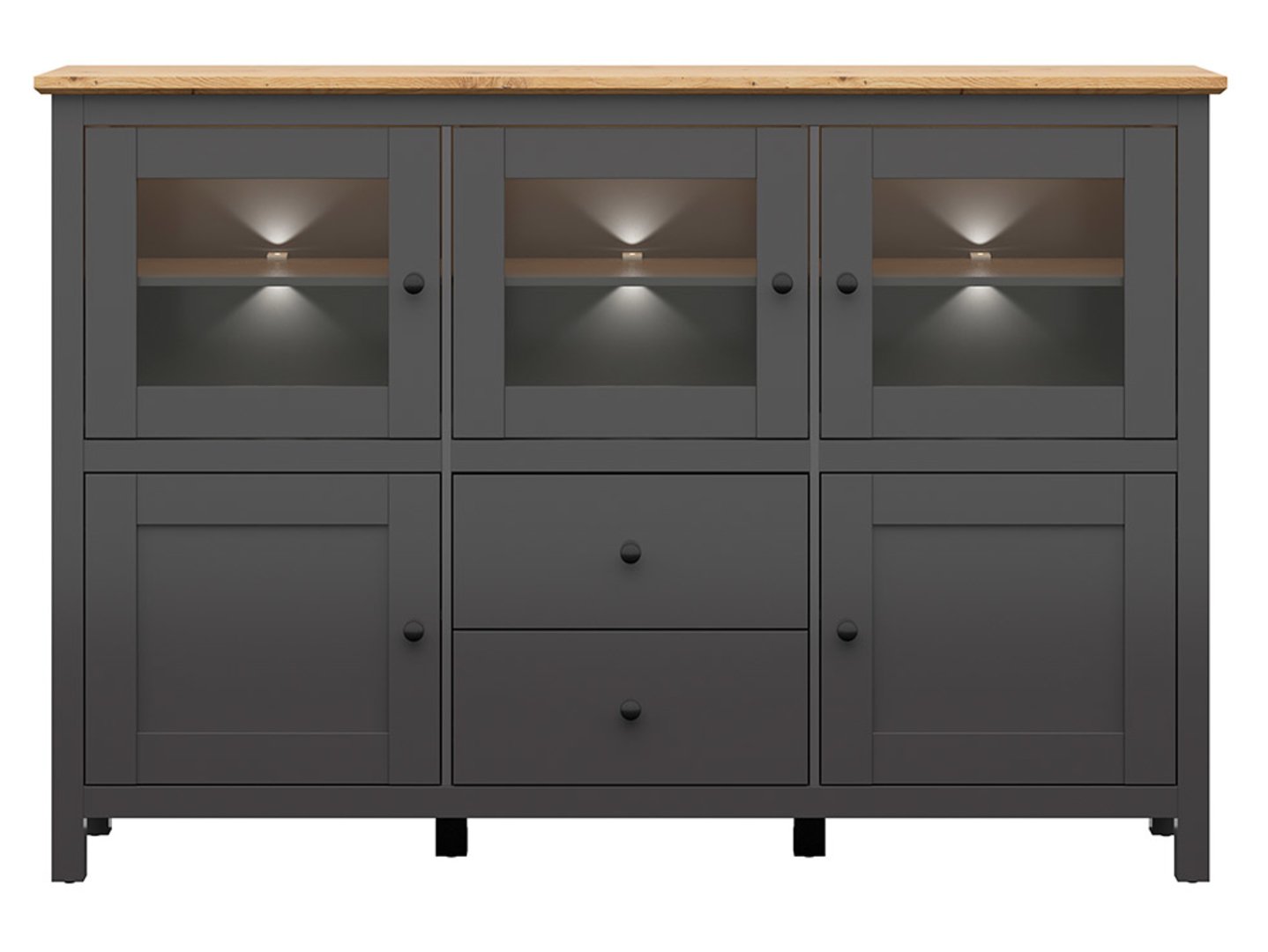 Penkių durų komoda su dviem stalčiais ir trimis stikliniais fasadais HESEN 186 cm grafito/artistinio ąžuolo spalvos