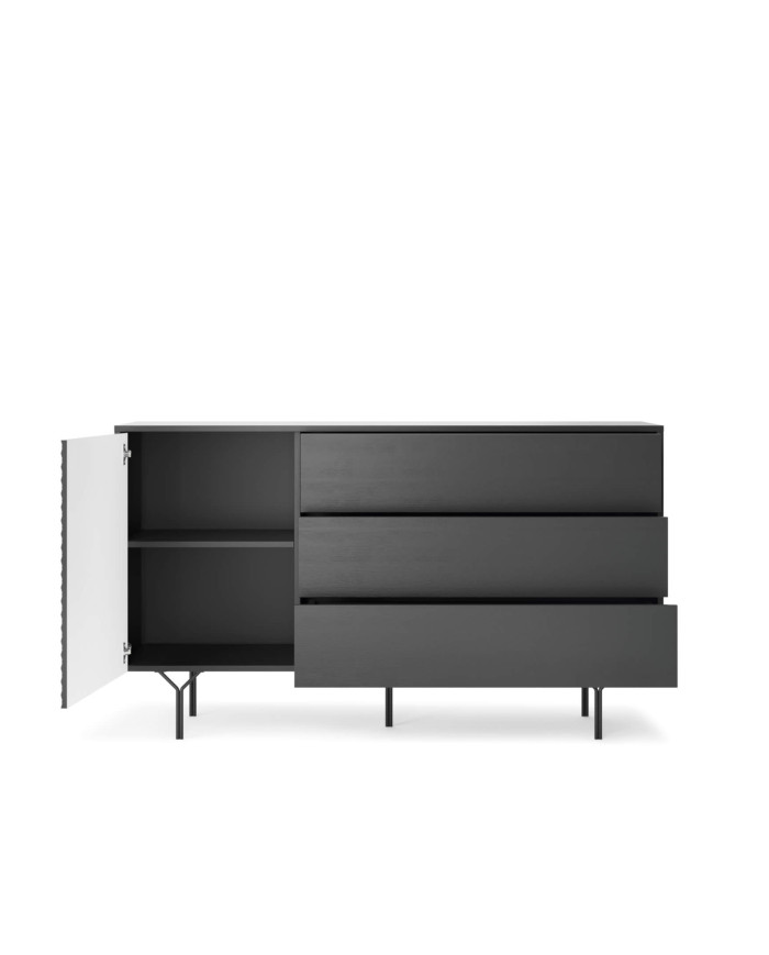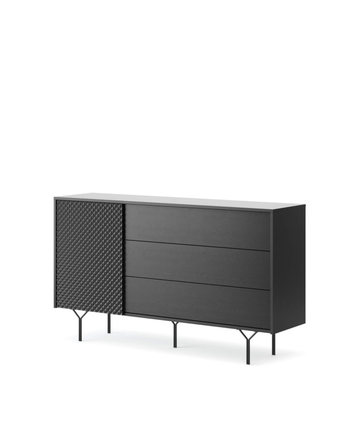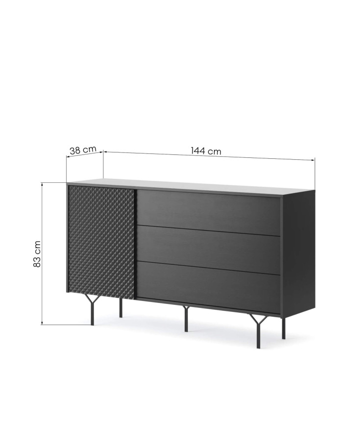 Patraukli „Raven KSZ144“ komoda pasižymi moderniu, modernistiniu stiliumi. Dėl unikalaus dizaino ji puikiai dera minimalistiniame, industriniame ir net lofto stiliaus interjere. Unikalų komplekto charakterį pabrėžia 3D dekoratyvinis elementas ant patvarios MDF priekinės dalies. Už varstomų durelių yra erdvi erdvė, padalinta horizontalia lentyna. Trys dideli, praktiški stalčiai leidžia tvarkingai laikyti įvairius daiktus ir smulkius daiktus. Visas baldas stovi ant plonų metalinių kojelių, todėl po jais lengva valyti naudojant valymo robotus. Komoda priklauso to paties pavadinimo baldų kolekcijai, leidžiančiai sukurti darnius dizaino ir spalvų komplektus. Komplektą reikia surinkti, jis tiekiamas su instrukcijomis ir pilnu furnitūros komplektu.