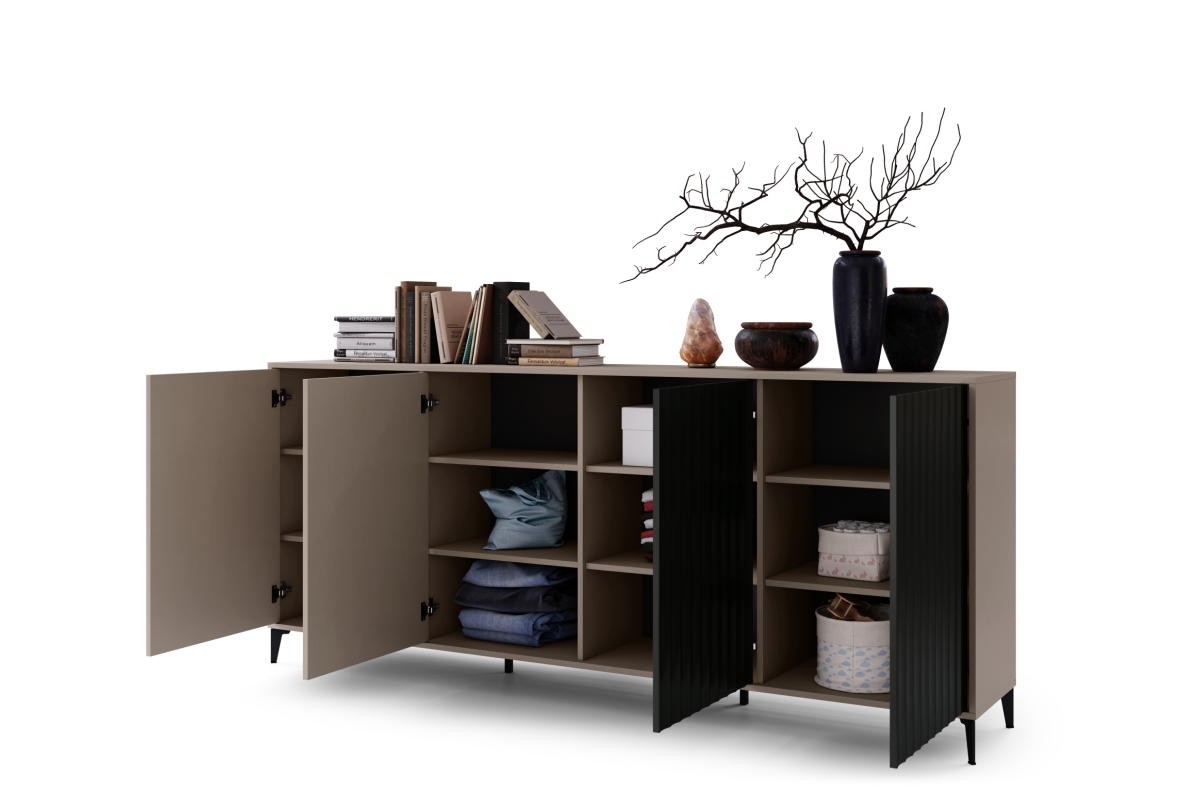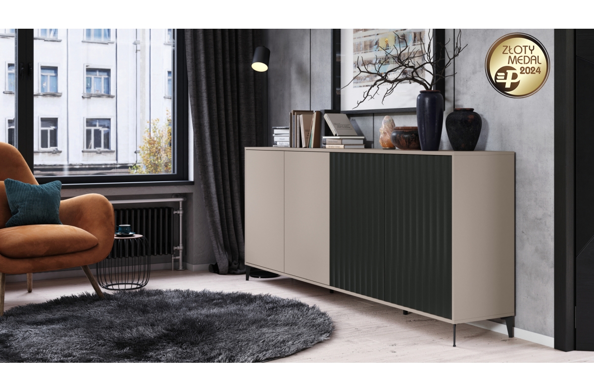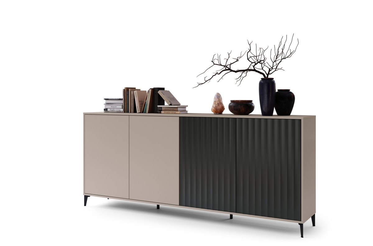 RIMINI K-242 Smėlinės pilkos/matinės juodos spalvos komoda – MODERNI SPINTELĖ SU GRIOVIUOTAIS PRIEKINIAIS