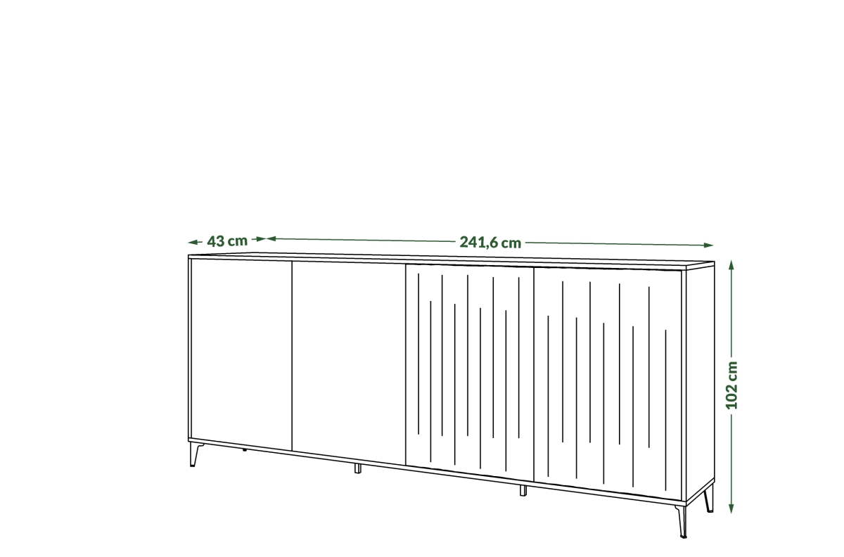 PLOTIS 241,6 cm, GYLIS 43 cm, AUKŠTIS 102 cm, MEDŽIAGOS Medžio drožlių plokštė/MDF, milteliniu būdu dažytas plienas, PAVIRŠIUS Matinis, STILIUS Modernus, SVORIS SU PAKUOTE 102,4 kg, KITA Gaminys skirtas savarankiškam surinkimui su pateiktomis instrukcijomis