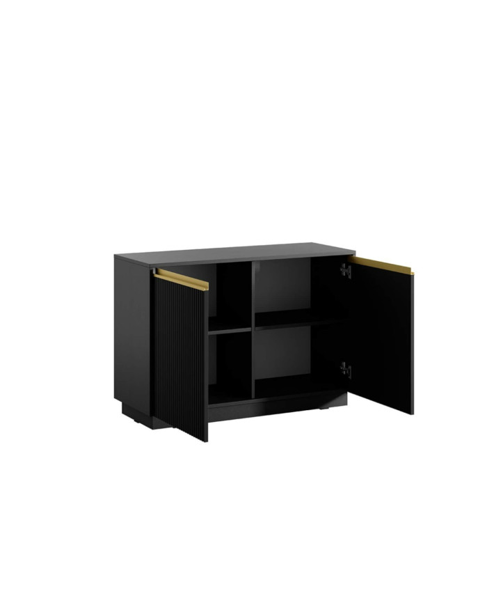 Juoda komoda „Royal K104“ puikiai atrodys tiek moderniame, tiek prabangiame ar klasikiniame svetainės interjere. Komplekto elegantišką charakterį pabrėžia vertikaliai grioveliais iš patvarios MDF plokštės pagaminti fasadai ir auksinės rankenėlės. Visas baldas stovi ant tvirto cokolio, užtikrinančio tvirtą atramą. Dvidurės komodos viduje yra du uždari skyriai, atskirti vertikalia pertvara. Baldą galima įsigyti kelių spalvų ir jį reikia surinkti patiems.