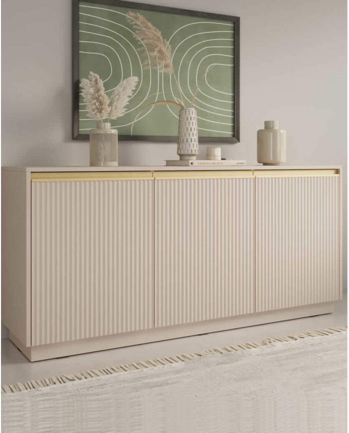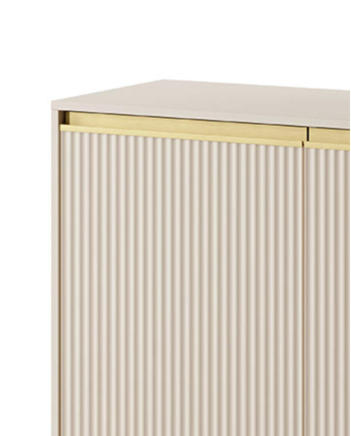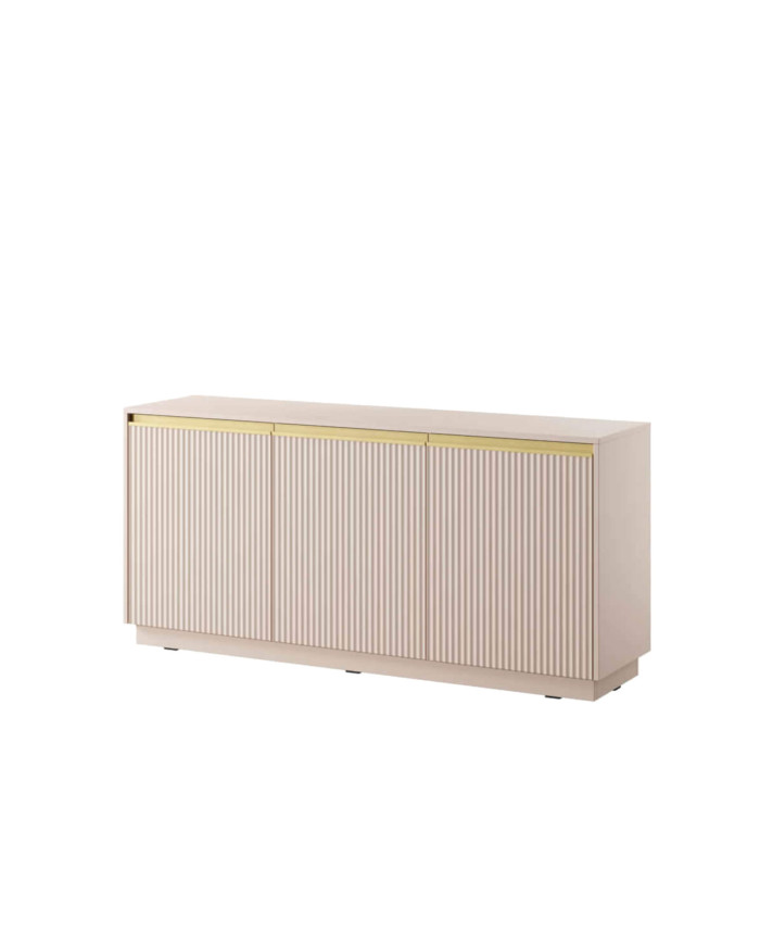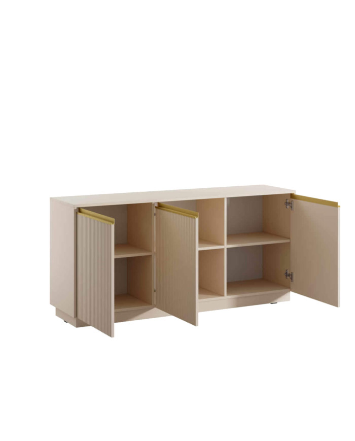Elegantiška trijų durų komoda ’Royal K154“ smėlio/aukso spalvos puikiai tiks tiek moderniame svetainėje, tiek prabangiame ar klasikiniame stiliuje. Komplekto elegantišką charakterį pabrėžia vertikaliai grioveliais iš patvarios MDF plokštės pagaminti fasadai ir auksinės rankenėlės. Visas komplektas stovi ant tvirto cokolio, užtikrinančio tvirtą atramą. Komodos viduje yra trys supakuotos nišos, atskirtos horizontaliomis lentynomis. Baldas yra įvairių spalvų ir pristatomas supakuotas.