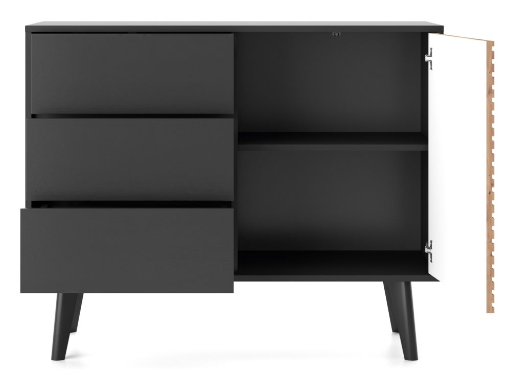 „Willow KSZ104“ komoda su grioveliais priekyje – turi spintelę, lentyną už priekio ir tris papildomus stalčius.