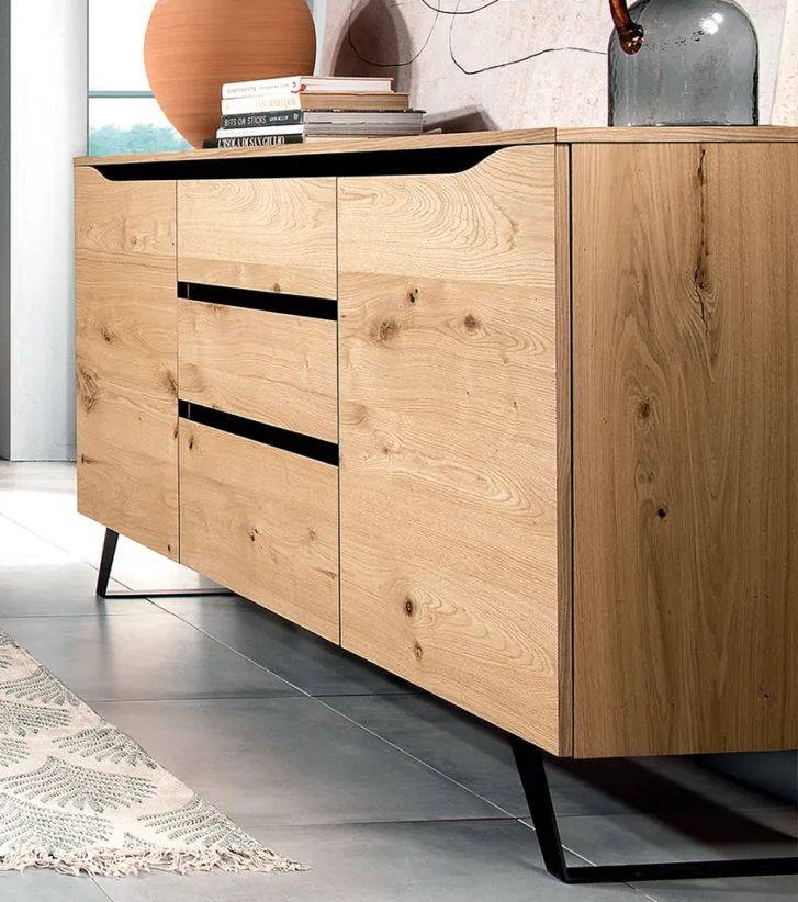 Plati komoda MALAGA MA–K3sz. Natūrali ąžuolo medienos tekstūra sukuria šiltą, šiuolaikišką charakterį. Juodos plieninės kojelės ir juoda apdaila – tai šiuolaikinio modernumo, dvelkiančio praeities nostalgija, išraiška. Vitrinoms naudojamos šiurkščios tekstūruotos nugarėlės, o subtilus lentynų apšvietimas išryškina ąžuolo konstrukcijos žavesį. Viršus: MDF, laminuotas ąžuolo fanera.