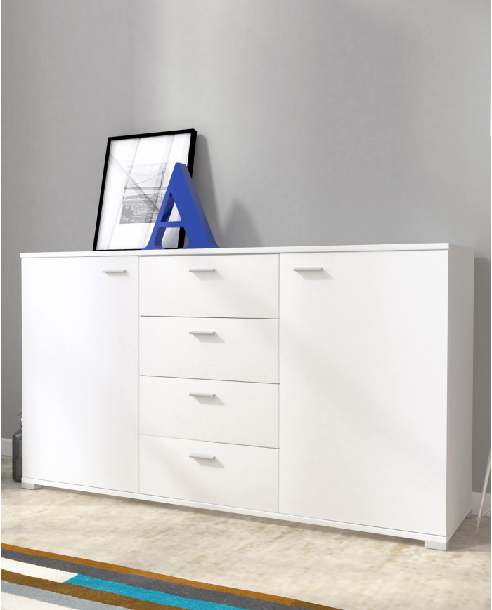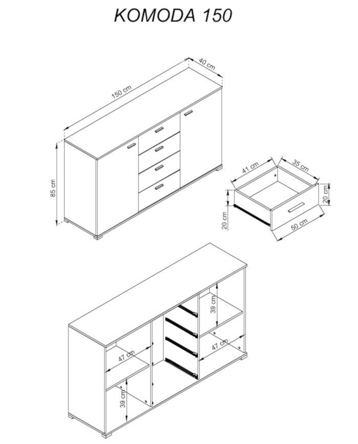 Ši didelė ir erdvi 150 tipo komoda, matinės baltos spalvos, yra universalus šiuolaikinių miegamųjų, svetainių, svetainių ir koridorių papildymas. Pagaminta iš įbrėžimams atsparios laminuotos plokštės, komplekte yra dvejos varstomos durys ir keturi praktiški stalčiai su patogiomis rankenomis. Komoda, įskaitant duris ir stalčius, pristatoma paruošta savarankiškam surinkimui, su aiškiomis instrukcijomis ir furnitūra.