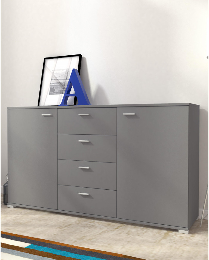 Ši didelė ir funkcionali 150 tipo grafito spalvos komoda yra universalus šiuolaikinių miegamųjų, svetainių, svetainių ir koridorių papildymas. Pagaminta iš įbrėžimams atsparios laminuotos plokštės, komplekte yra dvejos varstomos durys ir keturi praktiški stalčiai su patogiomis rankenomis. Komoda, įskaitant duris ir stalčius, pristatoma supakuota, kartu su lengvai suprantamomis surinkimo instrukcijomis ir furnitūra. Galima rinktis baltos arba Sonoma ąžuolo spalvos.