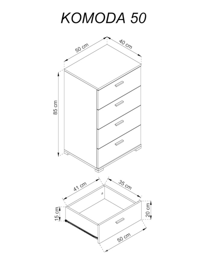 Ši moderni „Type 50“ komoda pagaminta iš įbrėžimams atsparios laminuotos plokštės. Dėl universalaus dizaino ji puikiai dera prie beveik bet kokio šiuolaikinio interjero stiliaus. Ji puikiai tinka miegamajam, valgomajam, svetainei ar net prieškambariui. Baldai pristatomi supakuoti su lengvai suprantamomis surinkimo instrukcijomis.