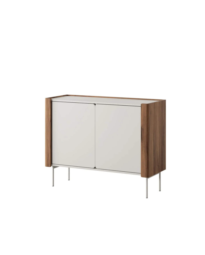 Moderni „Wrap K-105“ komoda traukia dėmesį savo unikaliu dizainu. Baldas pagamintas iš įbrėžimams atsparios laminuotos plokštės ir patvarios MDF plokštės su riešutmedžio apdaila. Komplektą sudaro dvejos švelniai užsidarančios varstomos durys, už kurių erdvę dalija horizontali lentyna. Komoda pasižymi užapvalintais durų kampais ir aukštomis metalinėmis kojelėmis. Komodą reikia surinkti, ji tiekiama su aiškiomis instrukcijomis ir pilnu furnitūros komplektu.