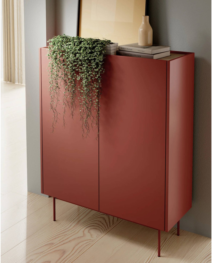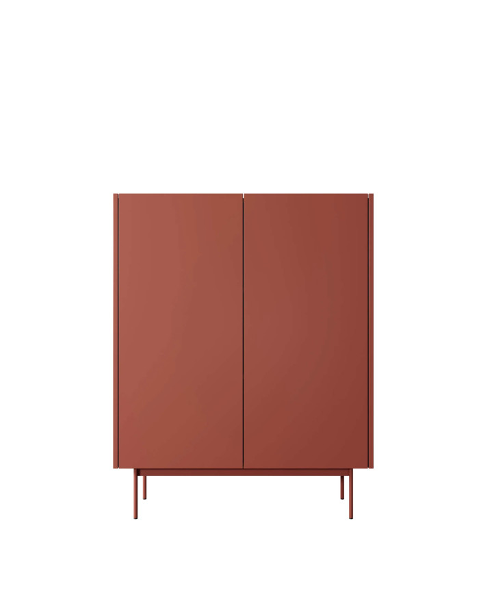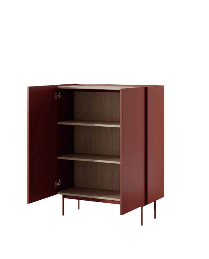 Aukšta komoda su durelėmis „Color KD97“ pasižymi raudonos keramikos spalvų gama priekyje ir korpuse, o viršuje ir viduje – „Linea Oak“ apdaila. Baldas pagamintas iš įbrėžimams atsparios laminuotos plokštės, todėl yra atsparesnis įbrėžimams ir lengvai valomas. Aukštoje komodoje yra dvi erdvios spintelės su varstomomis durelėmis, už kurių erdvę padalija dvi horizontalios lentynos. Komplektas išsiskiria patraukliu spalvų deriniu. Komoda pristatoma surinkta, su aiškiomis instrukcijomis ir furnitūra.