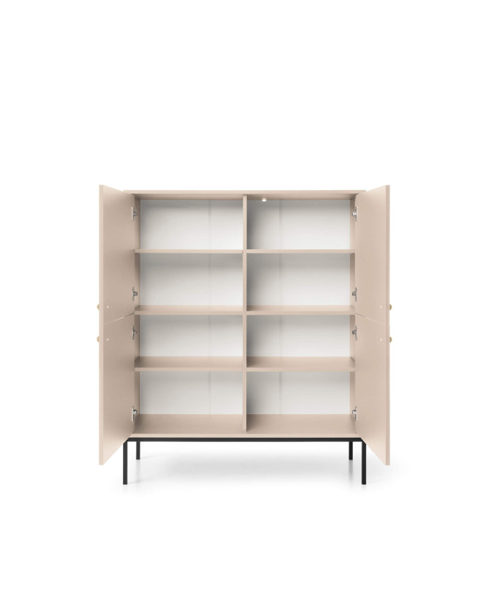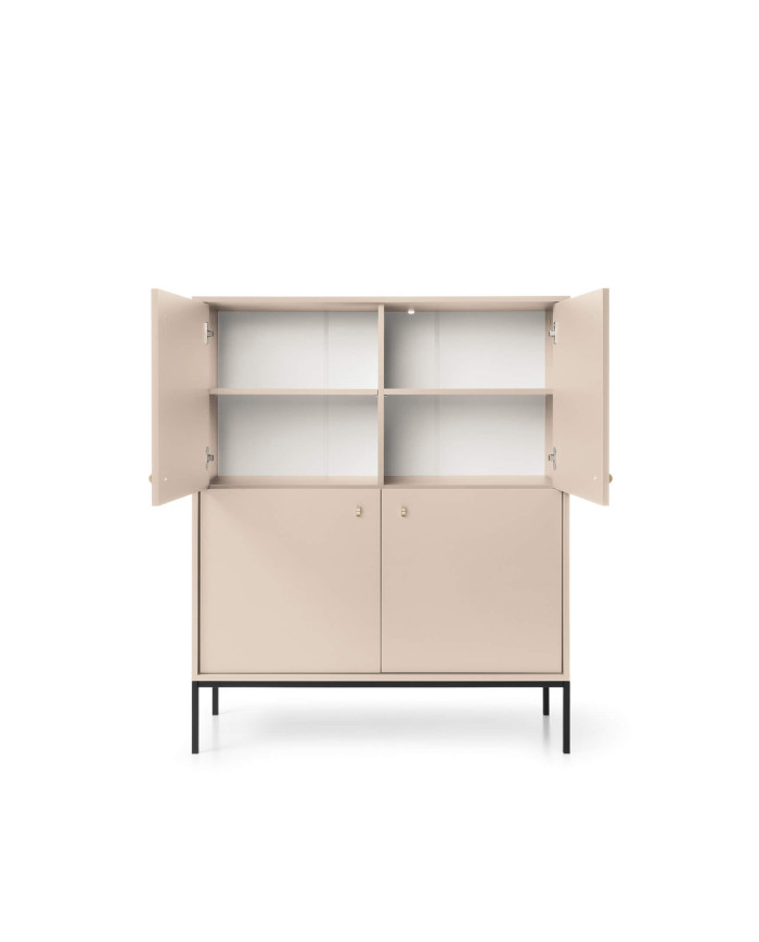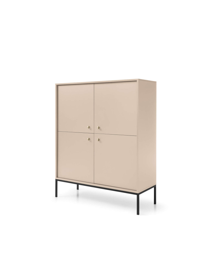 Moderni, keturių durų, aukšta komoda „Mono MK104“ – puikus pasirinkimas šiuolaikiškoms svetainėms ir darbo erdvėms. Baldų fasadai ir korpusas yra smėlio spalvos apdailos, o pagrindas – juodos spalvos. Spintelių fasadai papuošti prestižinėmis auksinėmis rankenėlėmis, kurios pabrėžia komplekto charakterį. Spintelė pagaminta iš laminuotos baldų plokštės, kuri yra atsparesnė įbrėžimams. Aukštos spintelės kojelės leidžia naudoti valymo robotus. Komoda priklauso to paties pavadinimo kolekcijai, kurią sudaro komodos, tualetinis staliukas, naktinis staliukas, kavos staliukas ir televizoriaus staliukas. Baldai pristatomi supakuoti su lengvai suprantamomis surinkimo instrukcijomis. Taip pat galima įsigyti su auksiniu pagrindu.