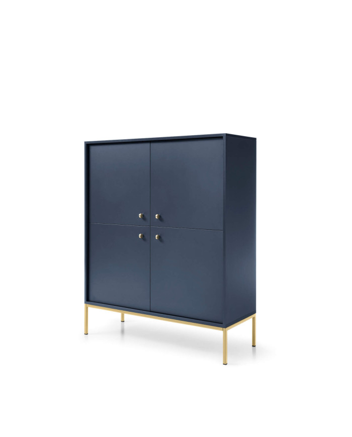Aukšta keturių durų komoda „Mono MK104“ – puikus pasirinkimas šiuolaikiškoms svetainėms ir darbo erdvėms. Baldų fasadai ir korpusas yra nudažyti matine tamsiai mėlyna spalva, o pagrindas – chromuotas auksinis. Spintelių fasadai papuošti prestižinėmis auksinėmis rankenėlėmis, kurios pabrėžia komplekto charakterį. Spintelė pagaminta iš laminuotos baldinės plokštės, kuri yra atsparesnė įbrėžimams. Komoda priklauso to paties pavadinimo kolekcijai, kurią sudaro komodos, tualetinis staliukas, naktinis staliukas, kavos staliukas ir televizoriaus staliukas. Baldai pristatomi išardyti su aiškiomis surinkimo instrukcijomis. Taip pat galima įsigyti versiją su juodu rėmu.
