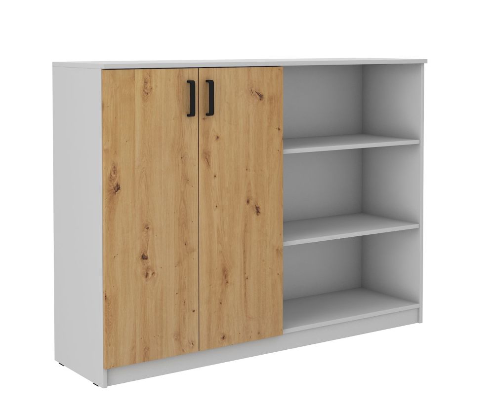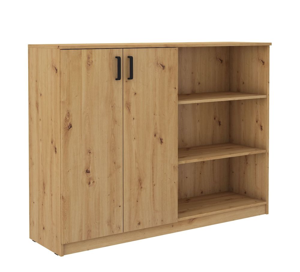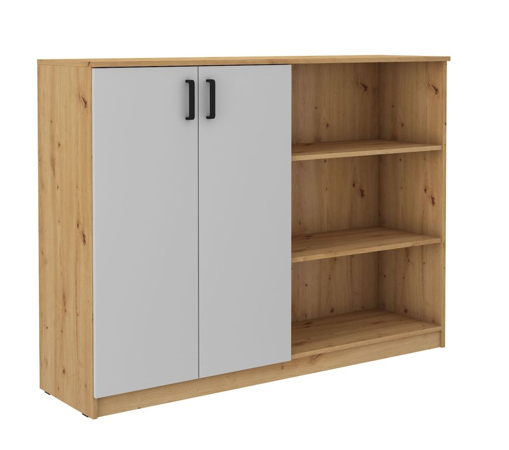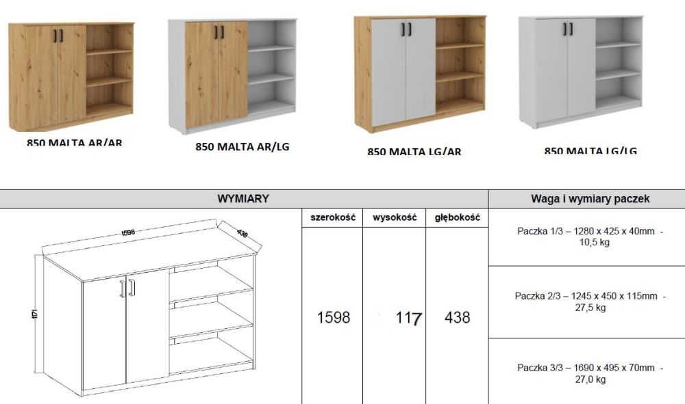 Aukšta komoda su dviem stalčiais ir lentynomis „Malta 850“ – lentynos už spintelės priekio, papildomos atviros lentynos.