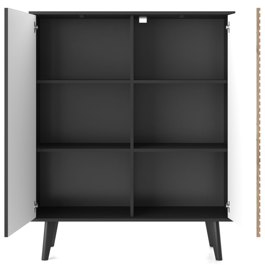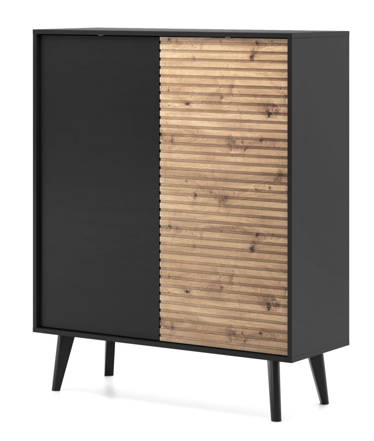 „Willow KD104“ aukšta komoda su grioveliais fasaduose – turi dvi spinteles su lentynomis už fasadų.