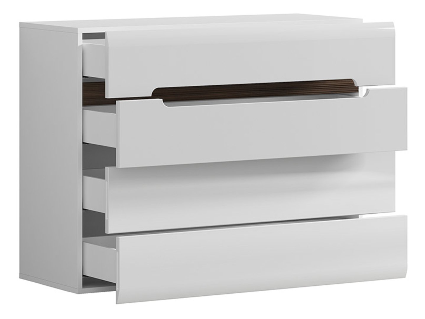 „Azteca Trio“ komoda – moderni, be rankenėlių daiktų laikymo sistema. „Azteca Trio“ kolekcija yra tikras modernaus dizaino perlas, o „Azteca Trio“ komoda – puikus elegancijos ir funkcionalumo, kurį galima pasiekti kruopščiai projektuojant baldus, pavyzdys. Jei vertinate tvarką ir organizuotumą, „Azteca Trio“ komoda tikrai jus pradžiugins. Turėdama keturis erdvius stalčius, ji puikiai tinka įvairaus dydžio daiktams laikyti. 105 cm pločio stalviršis puikiai tinka žibintui, šeimos nuotraukoms ar atostogų suvenyrams eksponuoti, todėl šis baldas ne tik praverčia daiktų laikymo srityje, bet ir suteikia interjerui elegancijos bei charakterio. Išskirtinis šios komodos bruožas – užapvalinti fasadų kraštai, suteikiantys jai modernią ir elegantišką išvaizdą. Tradicinių rankenėlių nebuvimas suteikia baldui minimalistinę ir harmoningą išvaizdą. „Azteca Trio“ komoda derina spalvų minimalizmą su ryškiomis detalėmis. Baltas korpusas kontrastuoja su blizgiais baltais fasadais. Dekoratyvinė juostelė nutraukia spalvų gamos monotoniją. Ji siūloma trijų spalvų: blizgios juodos, wenge magiško ąžuolo arba blizgios baltos. Jūs galite daryti įtaką galutinei baldo išvaizdai ir pritaikyti jį pagal savo skonį bei interjero stilių. Komfortas taip pat yra svarbus šios komodos aspektas. Stalčiai turi firmines kreipiančiąsias, kurios užtikrina tylų užsidarymą. Tai reiškia, kad komoda galite naudotis nekeldami jokio triukšmo ir netrukdydami kitiems namų ūkio nariams. Moderni „Azteca Trio“ komoda puikiai tinka įvairiems kambariams, pavyzdžiui, svetainei, miegamajam ar valgomajam. Ją galite naudoti vieną arba derinti su kitais kolekcijos baldais, sukurdami darnų ir stilingą interjero dizainą. Taip pat verta paminėti, kad kiekvienas „Azteca Trio“ kolekcijos baldas turi dvi dekoratyvines juosteles: vieną dvipusę (blizgi balta / blizgi juoda) ir vieną vienpusę („wenge magic“). Tai puikus priedas, leidžiantis dar labiau pritaikyti baldą pagal savo pageidavimus ir interjero stilių. Trumpai tariant, „Azteca Trio“ komoda yra ne tik praktiškas daiktų laikymo sprendimas, bet ir elegantiškas interjero dizaino elementas. Erdvumas, minimalistinis dizainas ir paprastas naudojimas daro ją puikiu pasirinkimu įvairiems jūsų namų kambariams. Tai baldas, kuris derina stilių ir praktiškumą, todėl bet koks interjeras tampa ir gražesnis, ir funkcionalesnis.