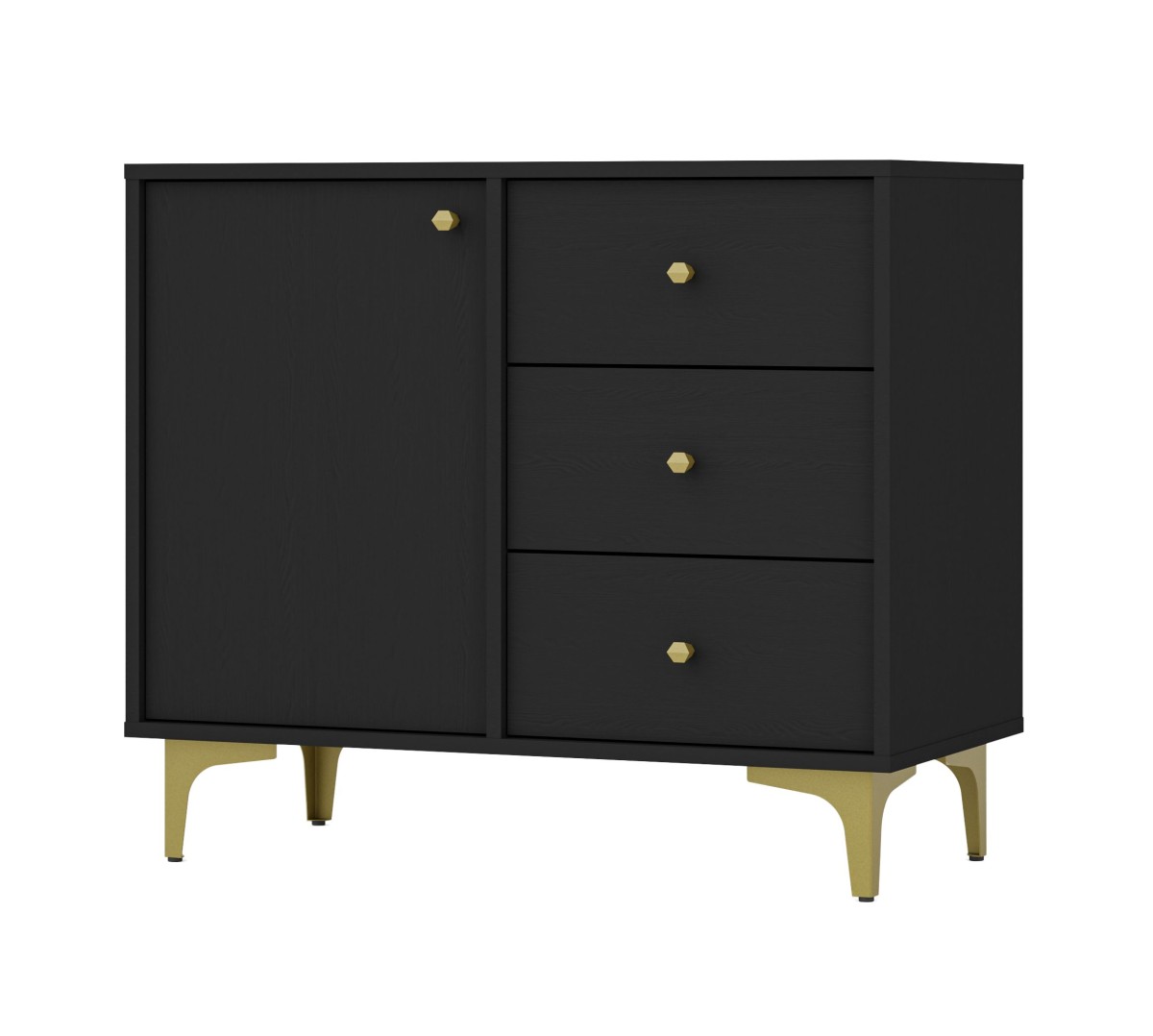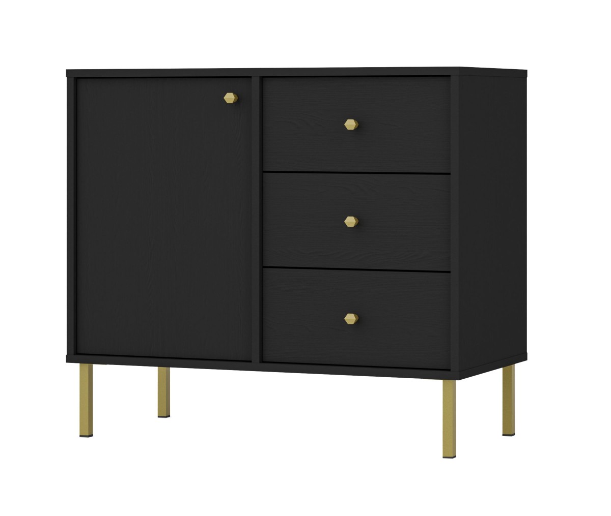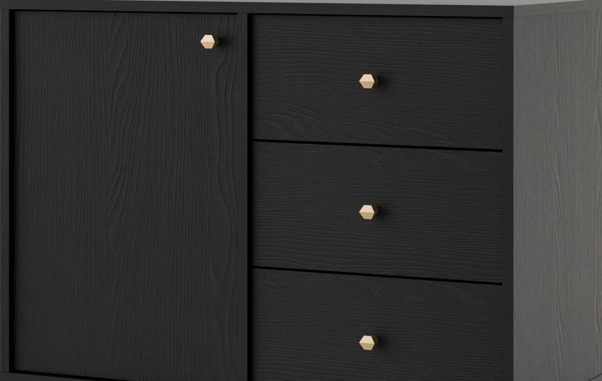 Juoda komoda „Tokyo 1F3S“ – su spintele ir trimis stalčiais.