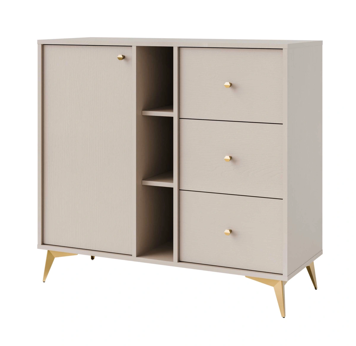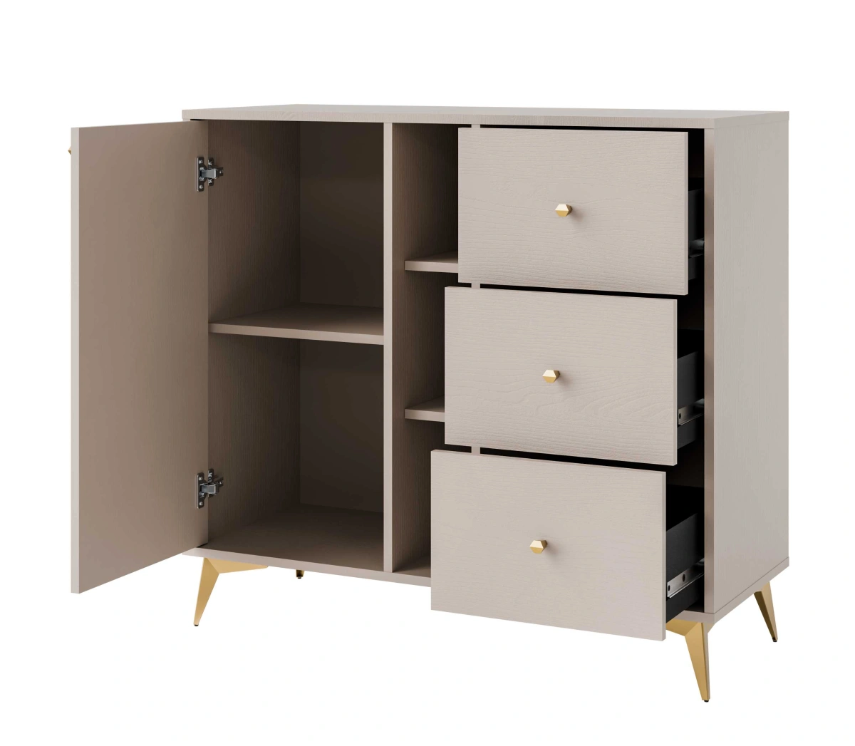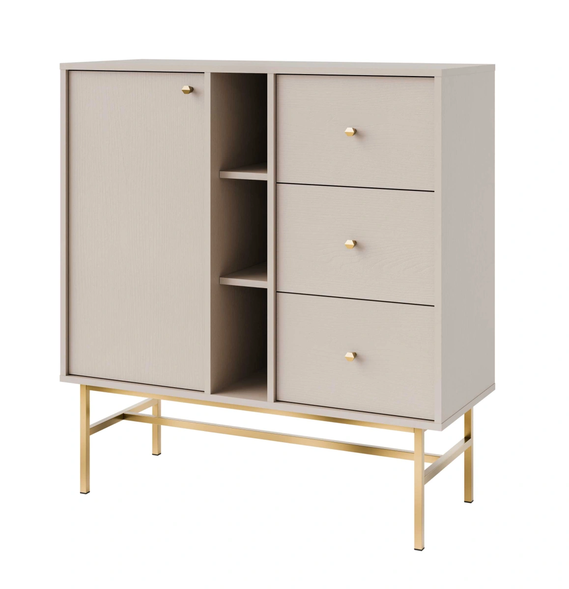 „Tokyo 1F3S Sand Beige“ komoda – turi spintelę, tris stalčius ir įleidžiamą vidų.