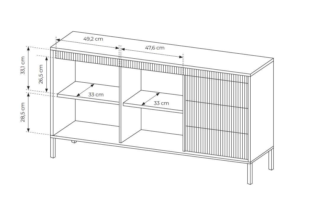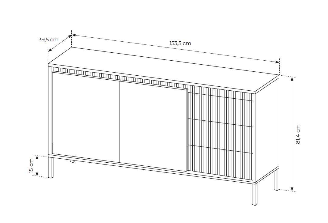 Komoda su grioveliais fasaduose 153 2D3S Senso – su dviem spintelėmis, lentynomis už fasadų ir trimis stalčiais.