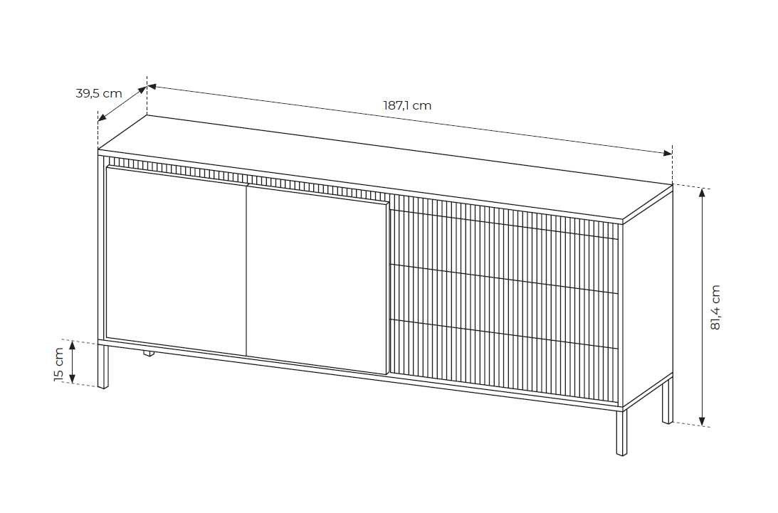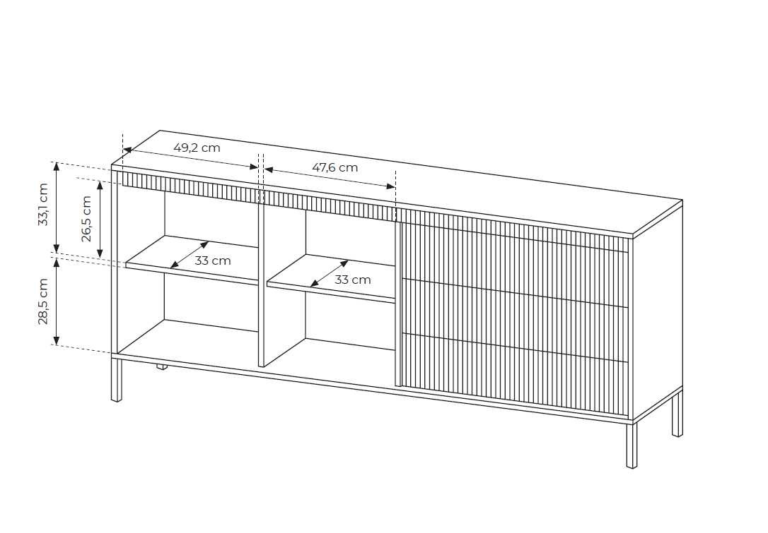 Komoda su grioveliais fasaduose 187 2D3S Senso – su dviem spintelėmis, lentynomis už fasadų ir trimis stalčiais.