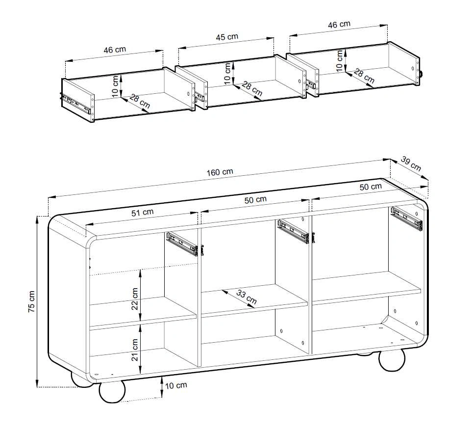 Albion KSZ160 komoda – turi tris spinteles – lentynas už fasadų, plius tris stalčius.