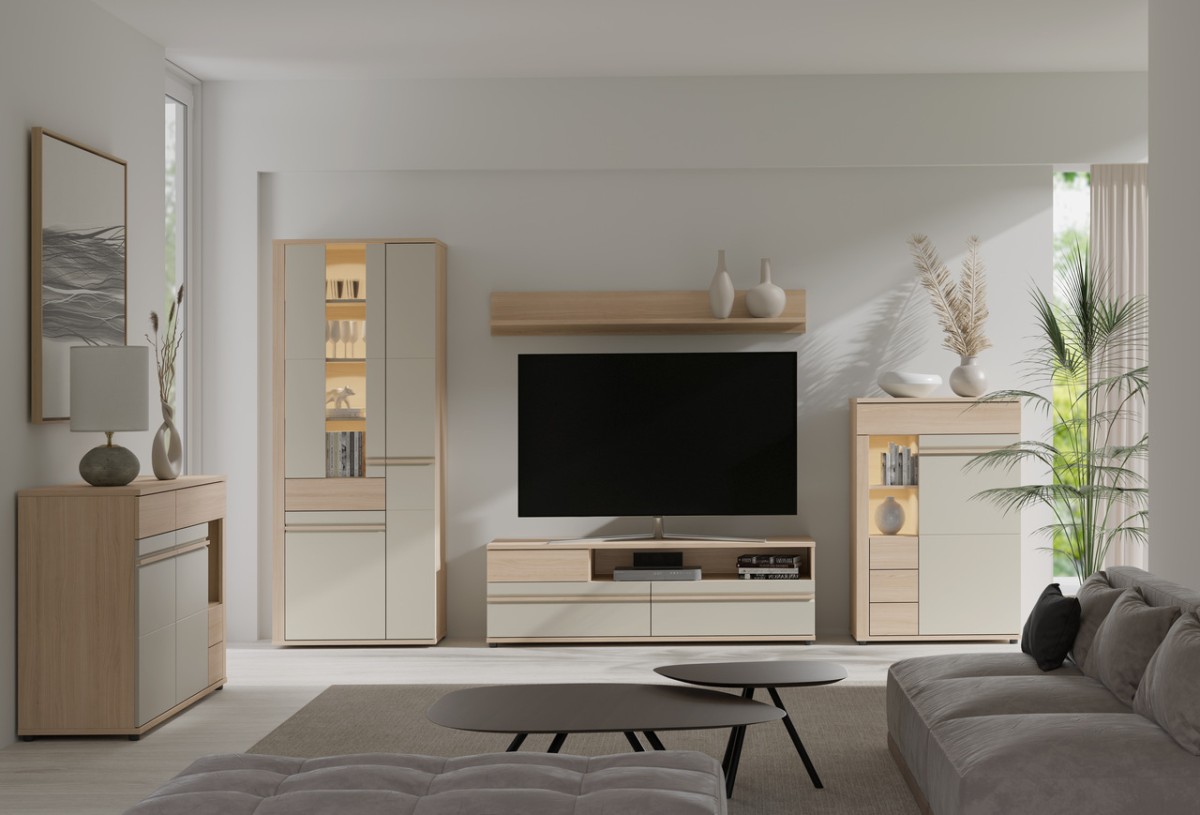 Moduliniai baldai „Oslo“ – modernus pasirinkimas su medžio imitacijos intarpais. Parametrai:
