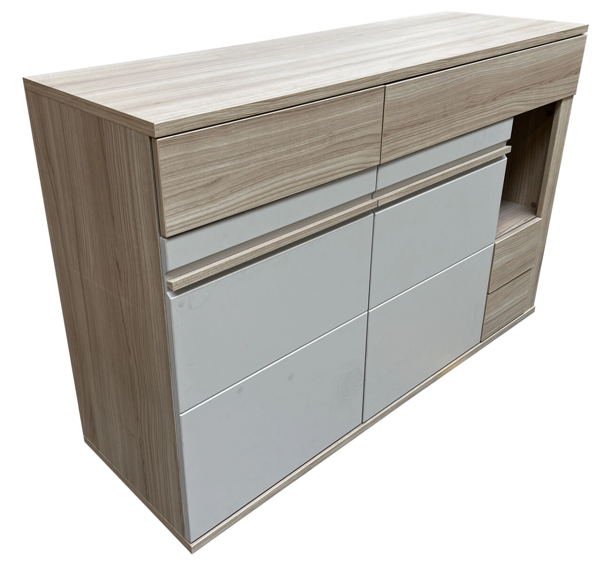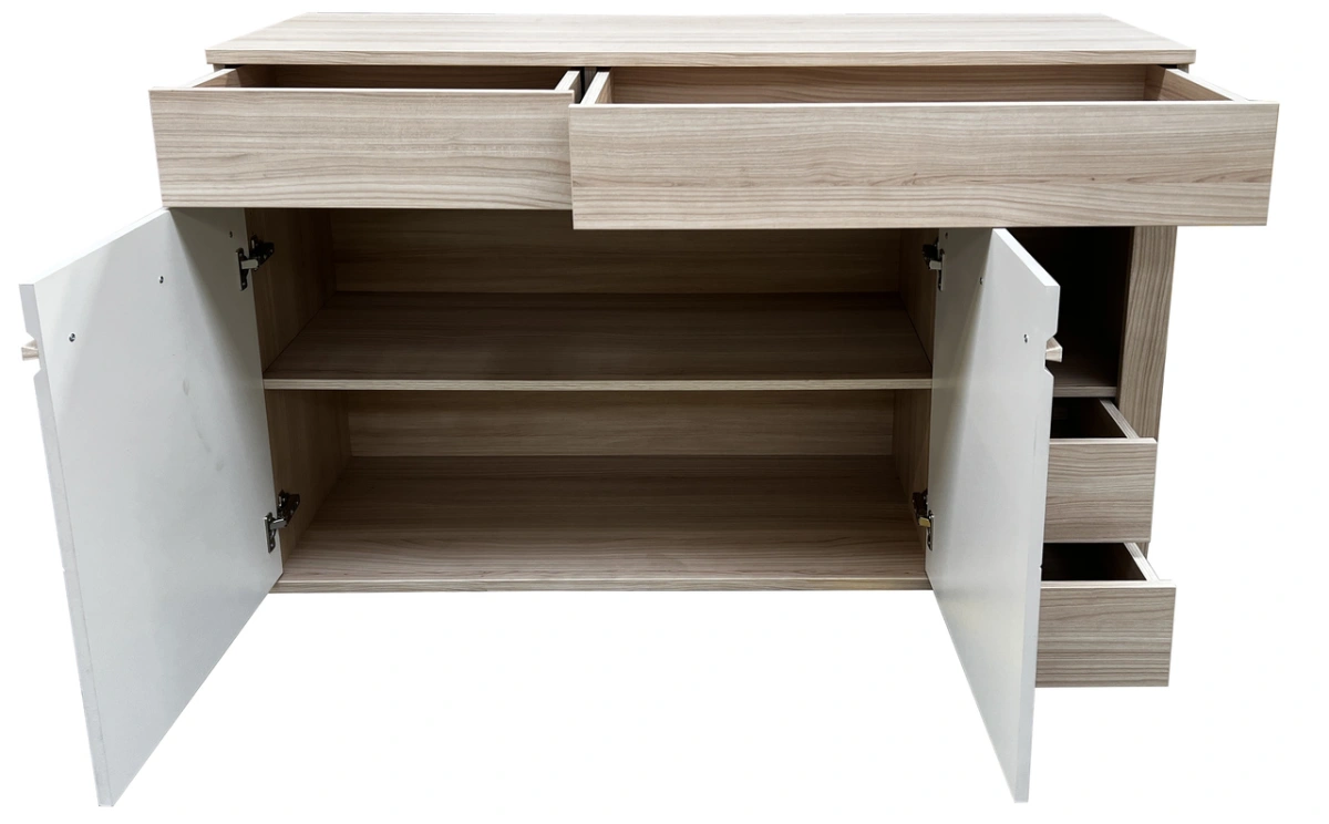 Komoda „Oslo OS12“ – su dviem spintelėmis, stalčiais ir dviem nišomis. Galerijoje – tikros nuotraukos iš antrojo mėnesio.