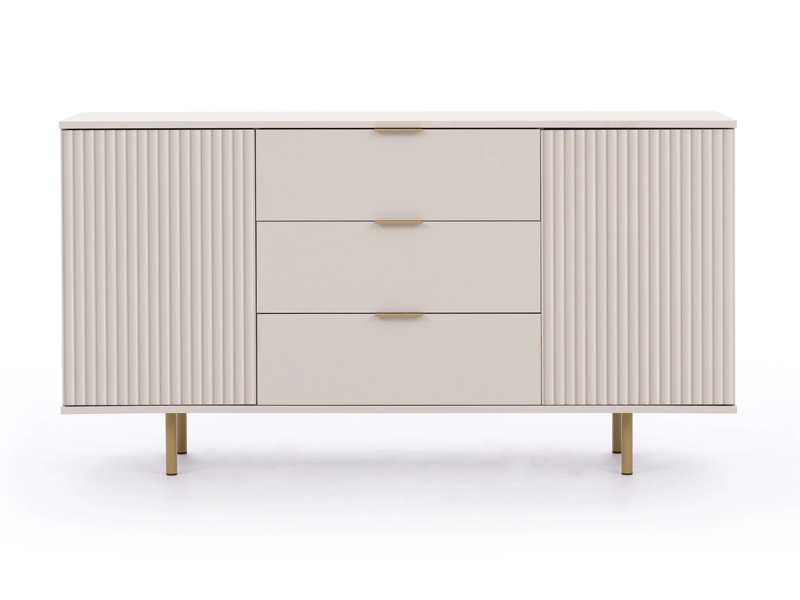 Sula komoda 150 cm smėlio spalvos, elegantiška ir funkcionali komoda su dekoratyviniais grioveliais fasaduose ir metalinėmis rankenomis
