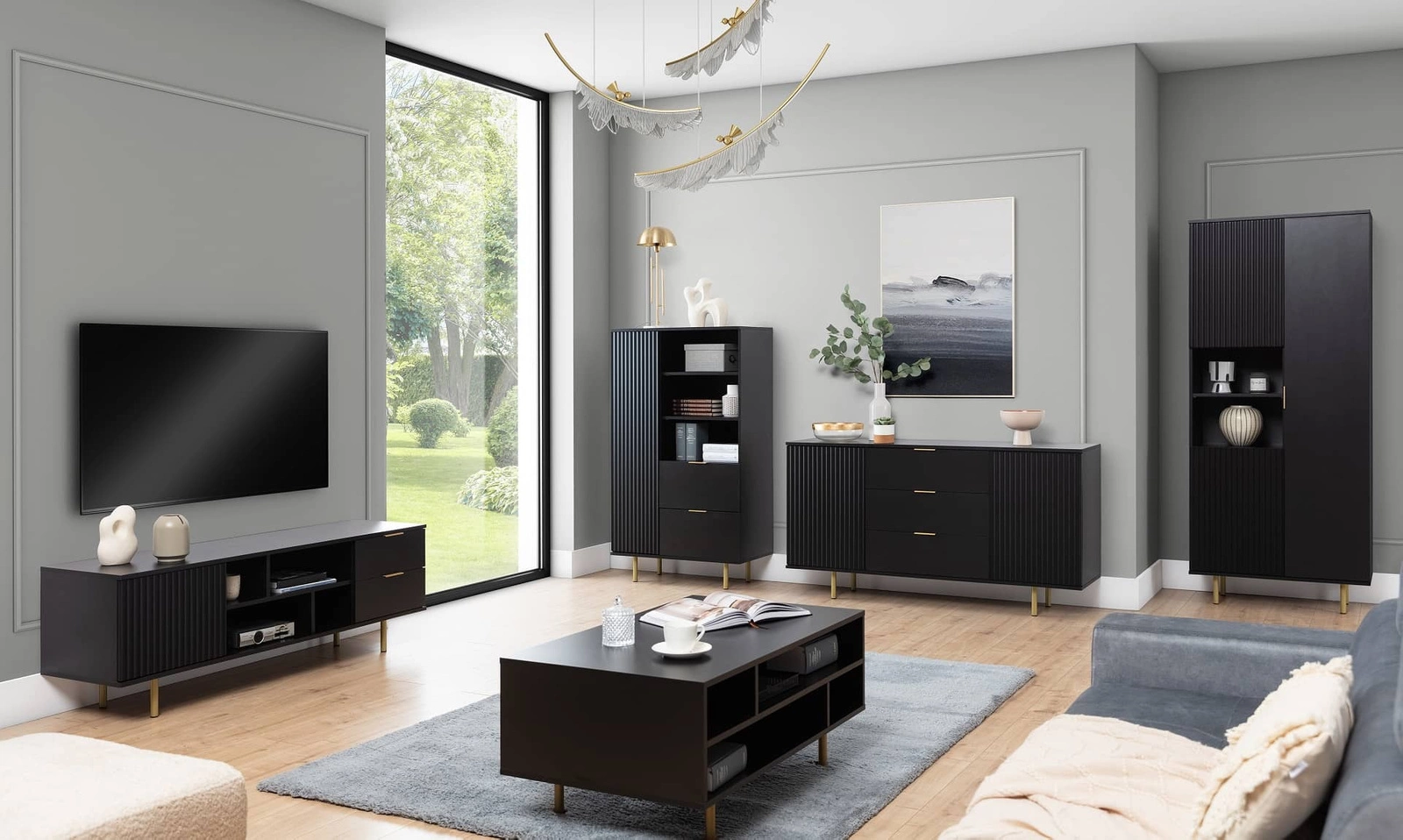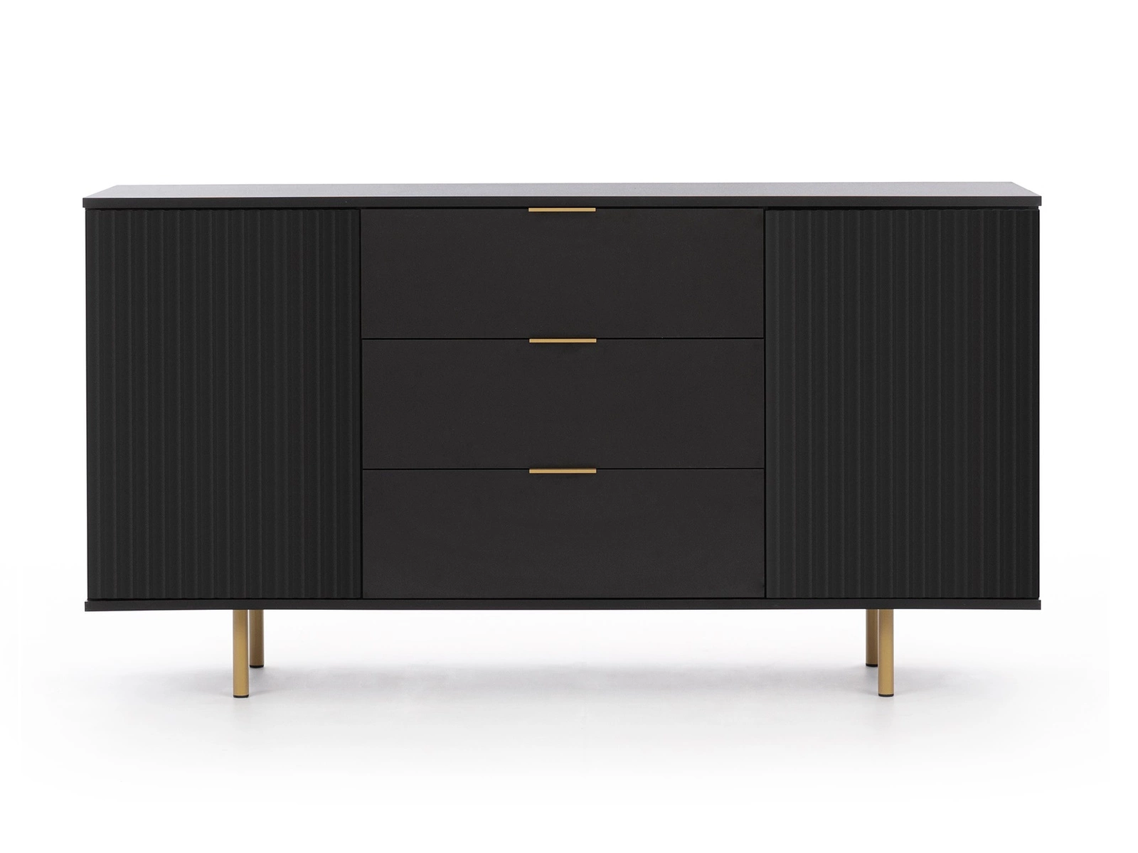 Sula komoda 150 cm juoda, elegantiška ir funkcionali komoda su dekoratyviniais grioveliais fasaduose ir metalinėmis rankenomis