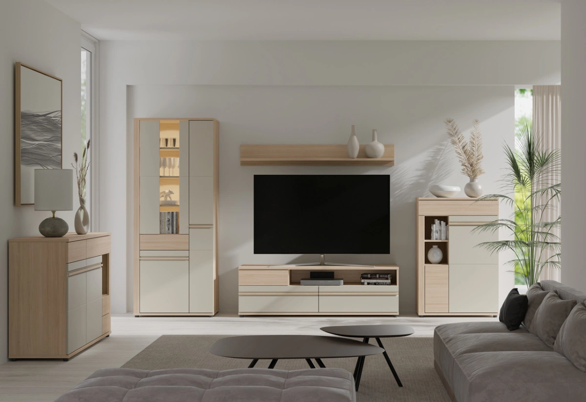 Moduliniai baldai „Oslo“ – modernus pasirinkimas su medžio imitacijos intarpais. Parametrai: