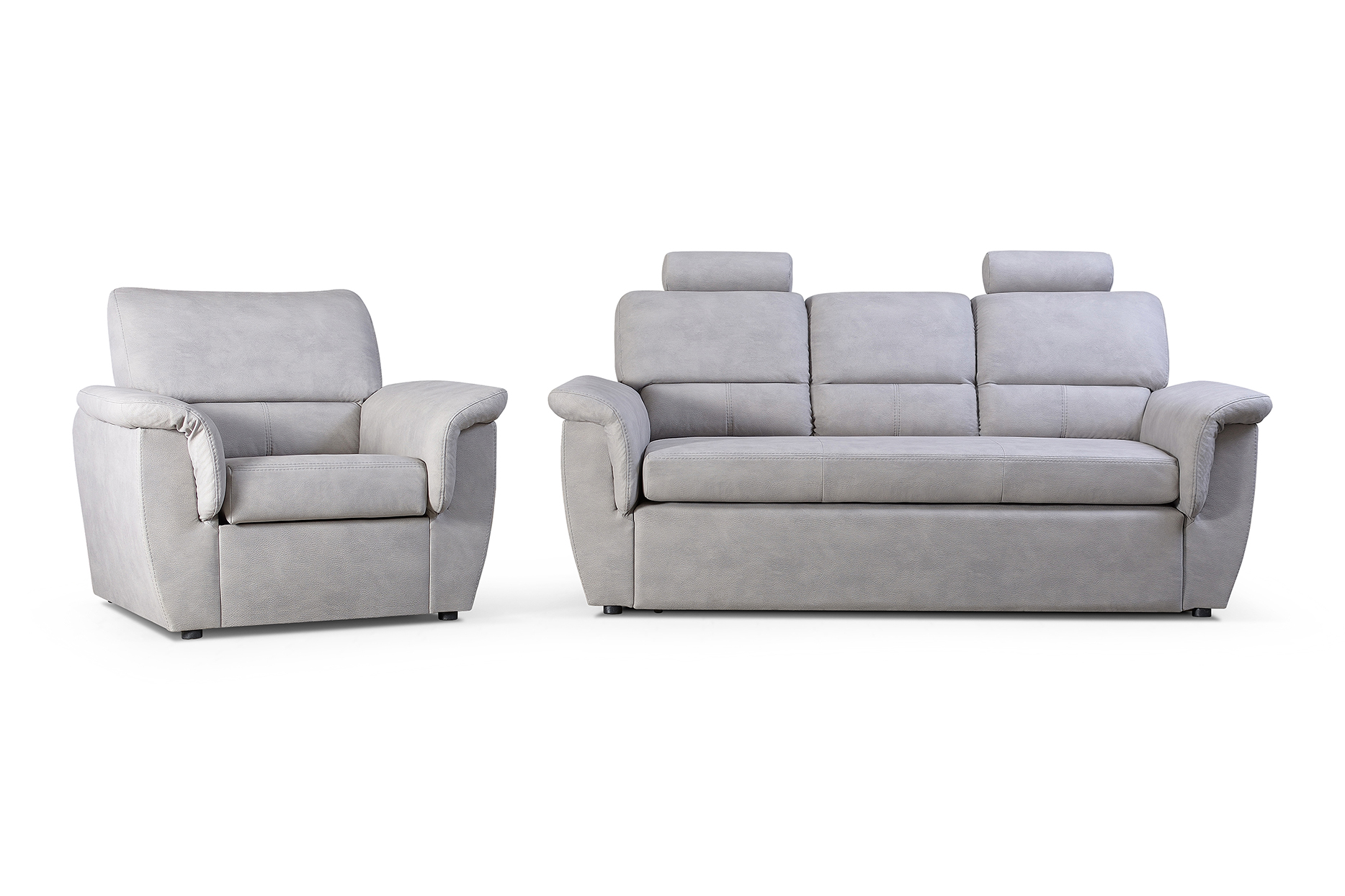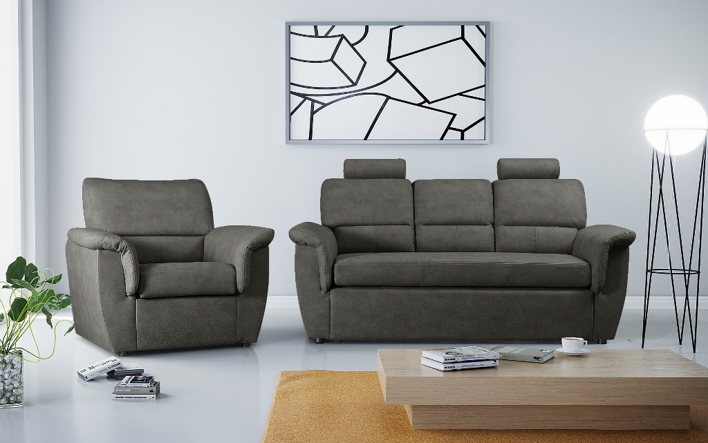 Svetainės komplekte yra sofa, trivietė sofa ir 2 foteliai.