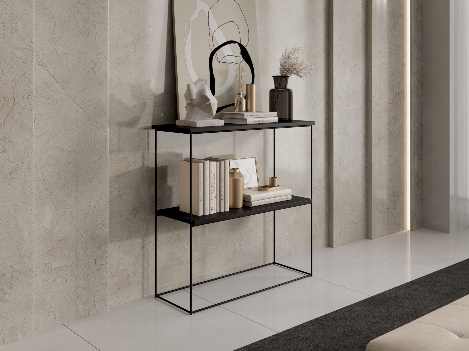 „Toni“ konsolinis staliukas – elegantiškas ir modernus baldas, puikiai tiksiantis įvairiuose interjeruose – nuo minimalistinio iki eklektiško. Išskirtinis šio konsolinio staliuko bruožas – vielinė koja, suteikianti jam lengvumo ir modernumo. Paprasta stalviršio forma puikiai dera su rafinuota metalinio pagrindo forma, sukurdama harmoningą visumą.