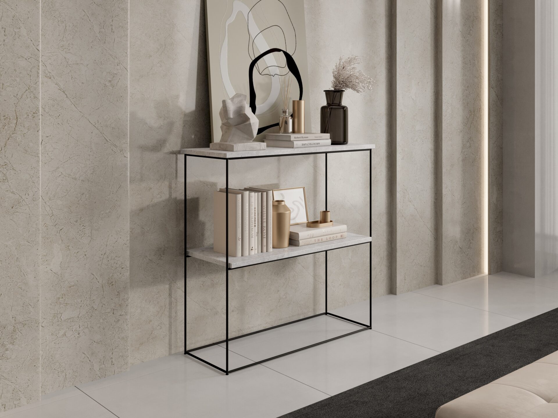 „Toni“ konsolinis staliukas – elegantiškas ir modernus baldas, puikiai tiksiantis įvairiuose interjeruose – nuo minimalistinio iki eklektiško. Išskirtinis šio konsolinio staliuko bruožas – vielinė koja, suteikianti jam lengvumo ir modernumo. Paprasta stalviršio forma puikiai dera su rafinuota metalinio pagrindo forma, sukurdama harmoningą visumą.