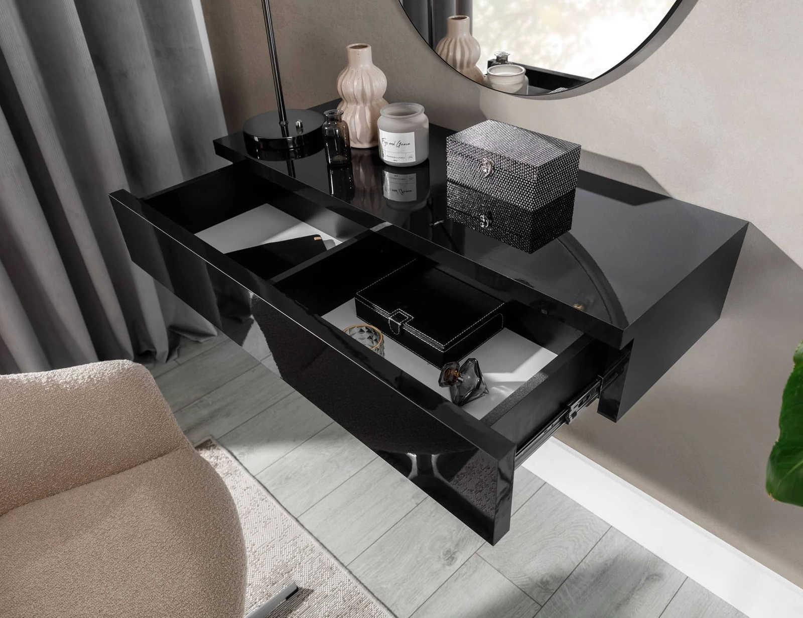 „Navene“ konsolinis staliukas puikiai tinka kaip tualetinis staliukas, ant kurio lengva susidėti moterišką kosmetiką ir niekučius. „Navene“ juodas blizgus pakabinamas konsolinis staliukas – tai modernumas ir elegancija viename.