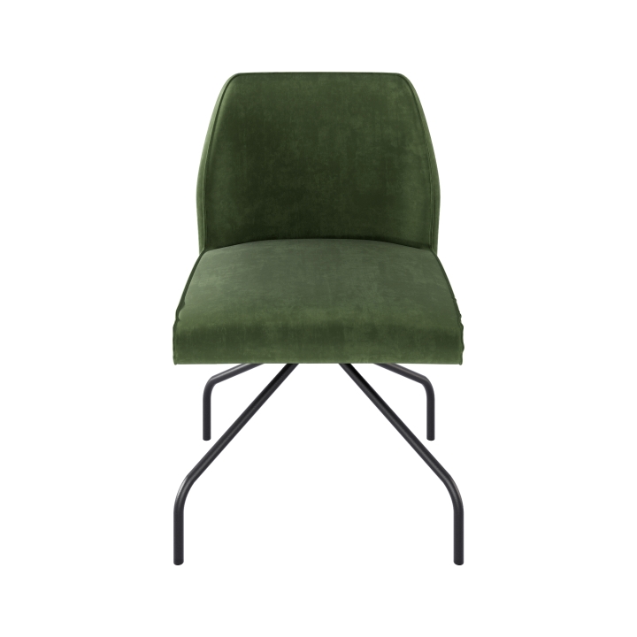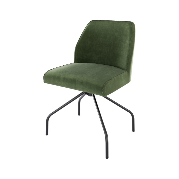 Kėdės rėmas turi juodą metalinį besisukantį pagrindą, užtikrinantį patvarumą ir atsparumą apkrovai. Aukštesnės kojelės palengvina valymą po kėde, o visa konstrukcija atrodo lengvesnė. Šis sprendimas pabrėžia jos tvirtumą ir dėmesį detalėms.