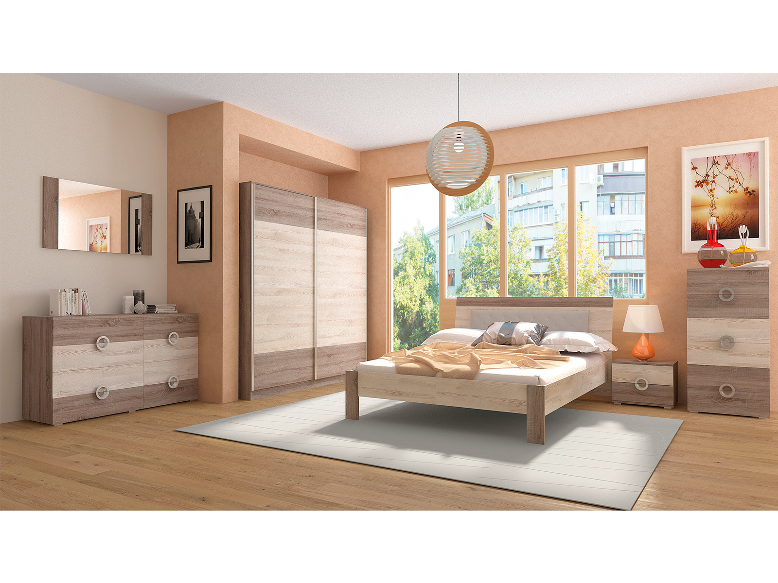 Šį miegamojo baldų komplektą sudaro lova, spinta, komoda ir naktiniai staleliai. Juos taip pat galima įsigyti atskirai, todėl galite susikurti savo miegamojo baldų komplektą pagal savo individualius pageidavimus. Jie yra patogūs ir erdvūs dėl gerai suprojektuotų daiktadėžių. Dėl aukščiausios kokybės meistriškumo jais galėsite džiaugtis ilgus metus. Komplektą sudaro:
