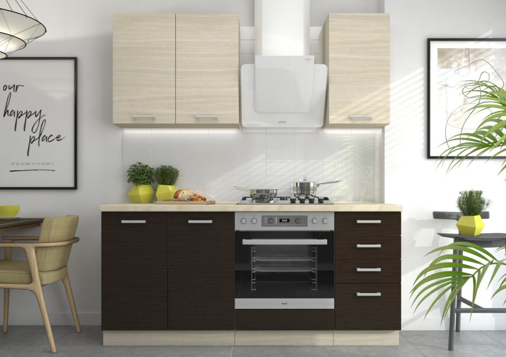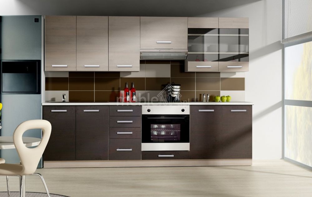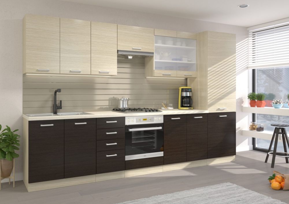 „Chamonix 260 cm“ virtuvė – tai virtuvės baldų komplektas, kurio paprastos, lengvos formos ir kontrastingos, madingos spalvos derės prie bet kokio modernaus interjero, o horizontalus raštas vizualiai padidins bet kokią mažą virtuvę. Komplektą sudaro: