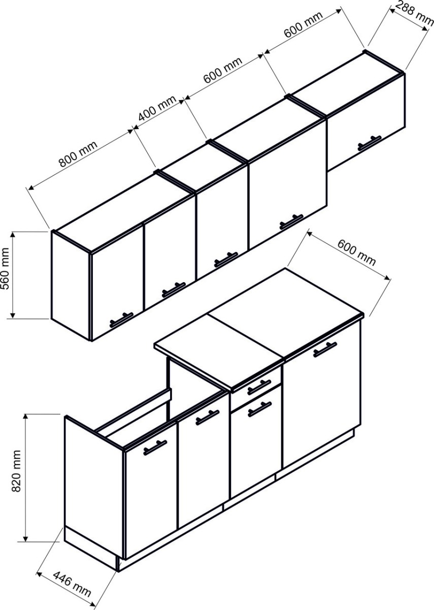 Matmenys: plotis [cm]>180–240 Komplekto plotis [cm]>240 | Viršutinių spintelių matmenys: plotis iš kairės [cm]>80/60/40/60 aukštis [cm]>56 gylis [cm]>28,8 | Apatinių spintelių matmenys: plotis iš kairės [cm]>80/60/40 aukštis be stalviršio [cm]>82 aukštis su stalviršiu [cm]>84,8 gylis be stalviršio [cm]>44,6 gylis su stalviršiu [cm]>60 | Virtuvės specifikacija – šviesaus medžio imitacijos fasadai | Virtuvės stilius – modernus | Fasadų tipas: Laminuota plokštė / MDF / Lakuota laminuota plokštė