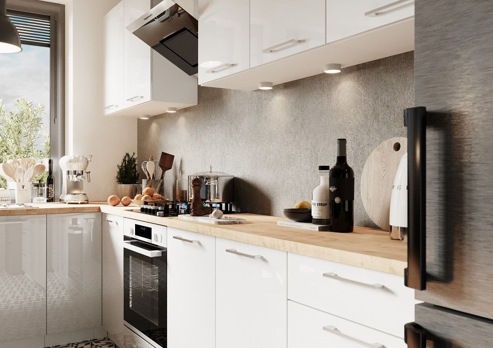 Virtuvės specifikacija – balta blizgi | Virtuvės stilius – modernus | Fasado tipas: Laminuota plokštė / MDF / Lakuota laminuota akrilinė plokštė | Matmenys: gylis [cm]>28,8; viršutinis gylis be stalviršio [cm]>44,6; gylis su stalviršiu [cm]>60; plotis [cm]>190–290; aukštis [cm]>72; viršutinis aukštis be stalviršio [cm]>82; aukštis su stalviršiu [cm]>84,8