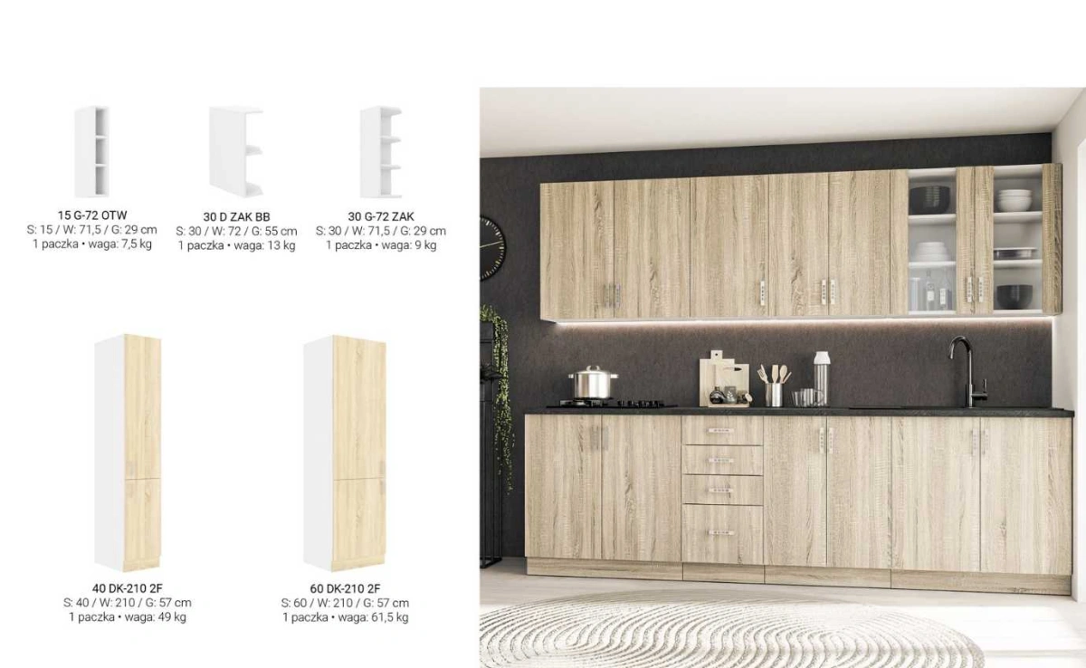 „Sara Kitchen“ – tai klasikinio dizaino virtuvės baldų komplektas, kuris papildys bet kokį stilingą interjerą. Galimybė pasirinkti papildomas spinteles arba užsisakyti visą virtuvę iš atskirų komponentų padės maksimaliai išnaudoti turimą erdvę.