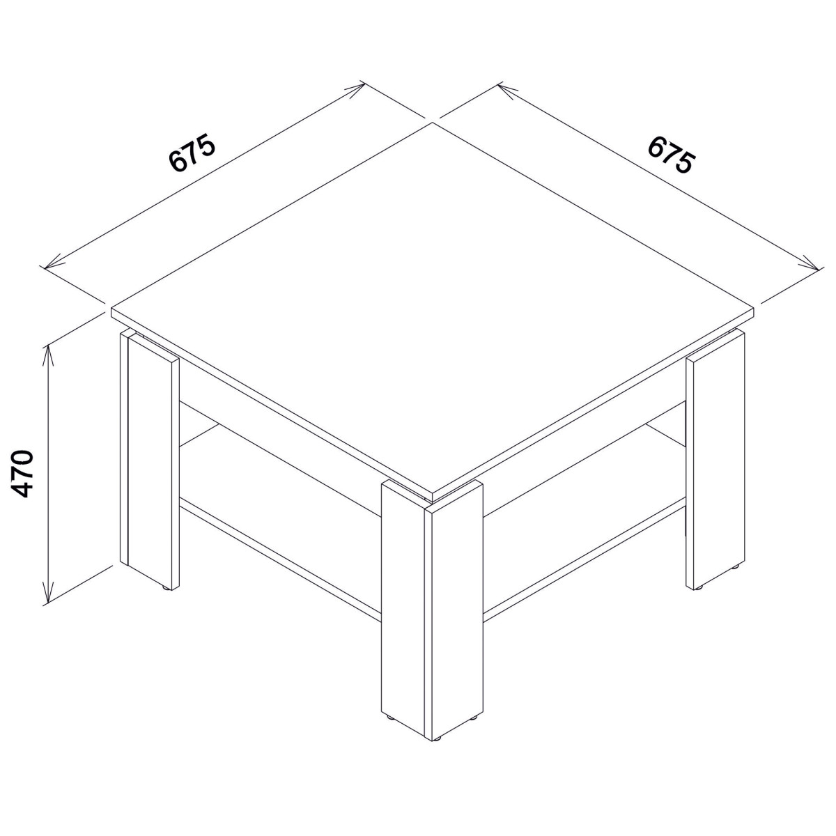 Plotis 67,5 cm Ilgis 67,5 cm Aukštis 46,5 cm Produkto svoris su pakuote 16,55 kg Gamintojo kodas / simbolis LA05 Produkto pakuočių skaičius 1 Stilius Modernus Įranga Surinkimo instrukcijos / surinkimo priedai Surinkimas Savarankiškam surinkimui Stalviršio medžiaga / tipas / storis laminuota medžio drožlių plokštė 16 mm Korpuso medžiaga / tipas / storis laminuota medžio drožlių plokštė 16 mm Lentynų kiekis 1