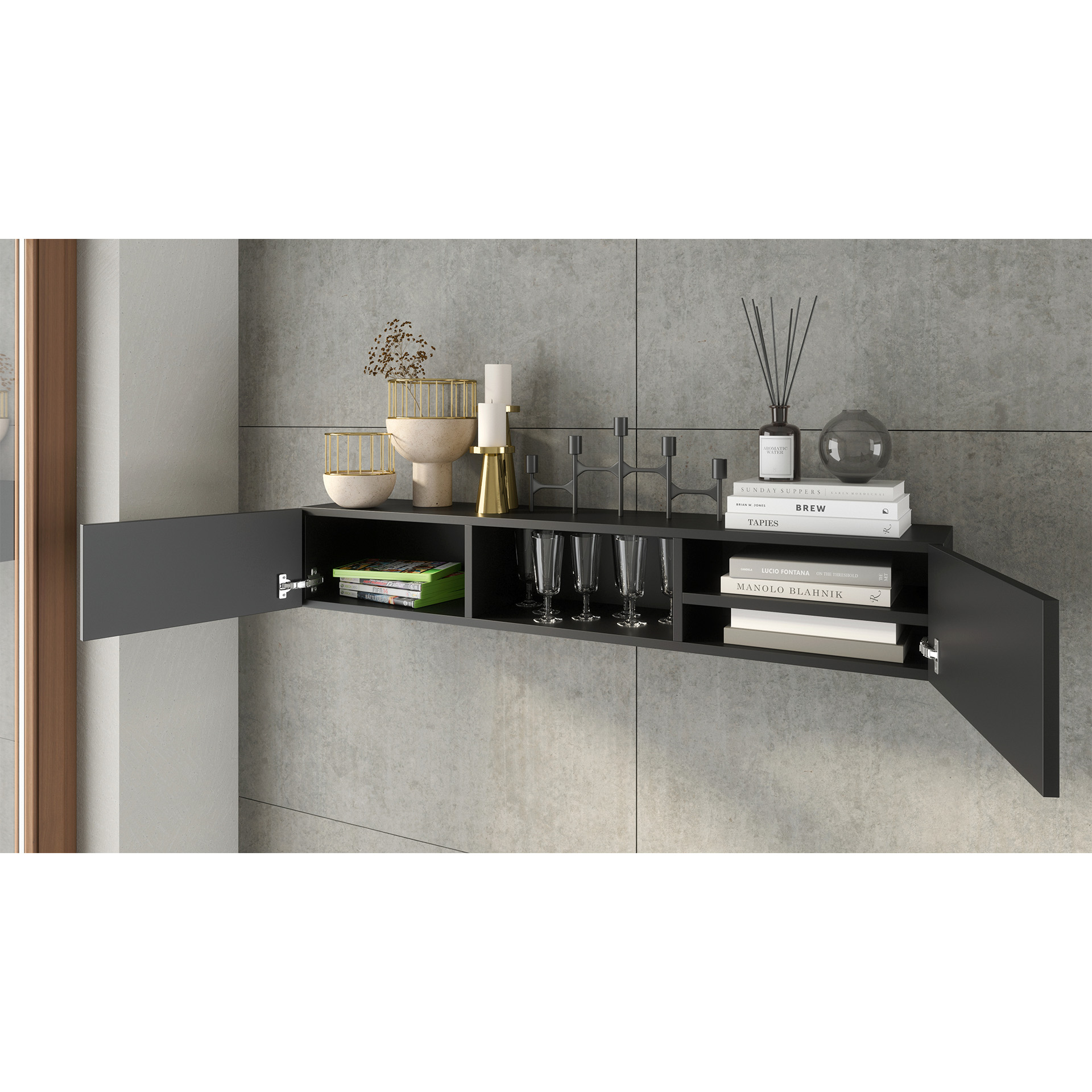Pakabinama lentyna „Lanzzi“ – tai unikalus baldas su įleidžiama vidine dalimi, vitrina ir dviem spintelėmis su stumiant atidaromomis durelėmis. 120 cm pločio ir 25 cm gylio lentyna puikiai tinka laikyti kelis smulkius daiktus. Praktiški įdėklai paslepia smulkius daiktus ir padeda išlaikyti švarą bei tvarką bet kuriame kambaryje. Pridedami išsiplėtimo kamščiai, reikalingi lentynos pakabinimui. Baldas pagamintas iš MDF ir laminuotos plokštės. Didžiausia pakabinamos spintelės „Lanzzi“ apkrova priklauso nuo sienos medžiagos, ant kurios ji tvirtinama. Galima rinktis iš dviejų spalvų. Lengvas surinkimas. Visos dalys yra komplekte. Aukštis: 20 cm. Gylis: 25 cm. Plotis: 120 cm. Svoris: 11 kg. Medžiagų konfigūracija: matinė juoda + meniškas ąžuolas / matinė juoda + matinė juoda. Rėmo spalva: juoda. Medžiaga: MDF. Durų skaičius: 2. Lentynų skaičius: 3.