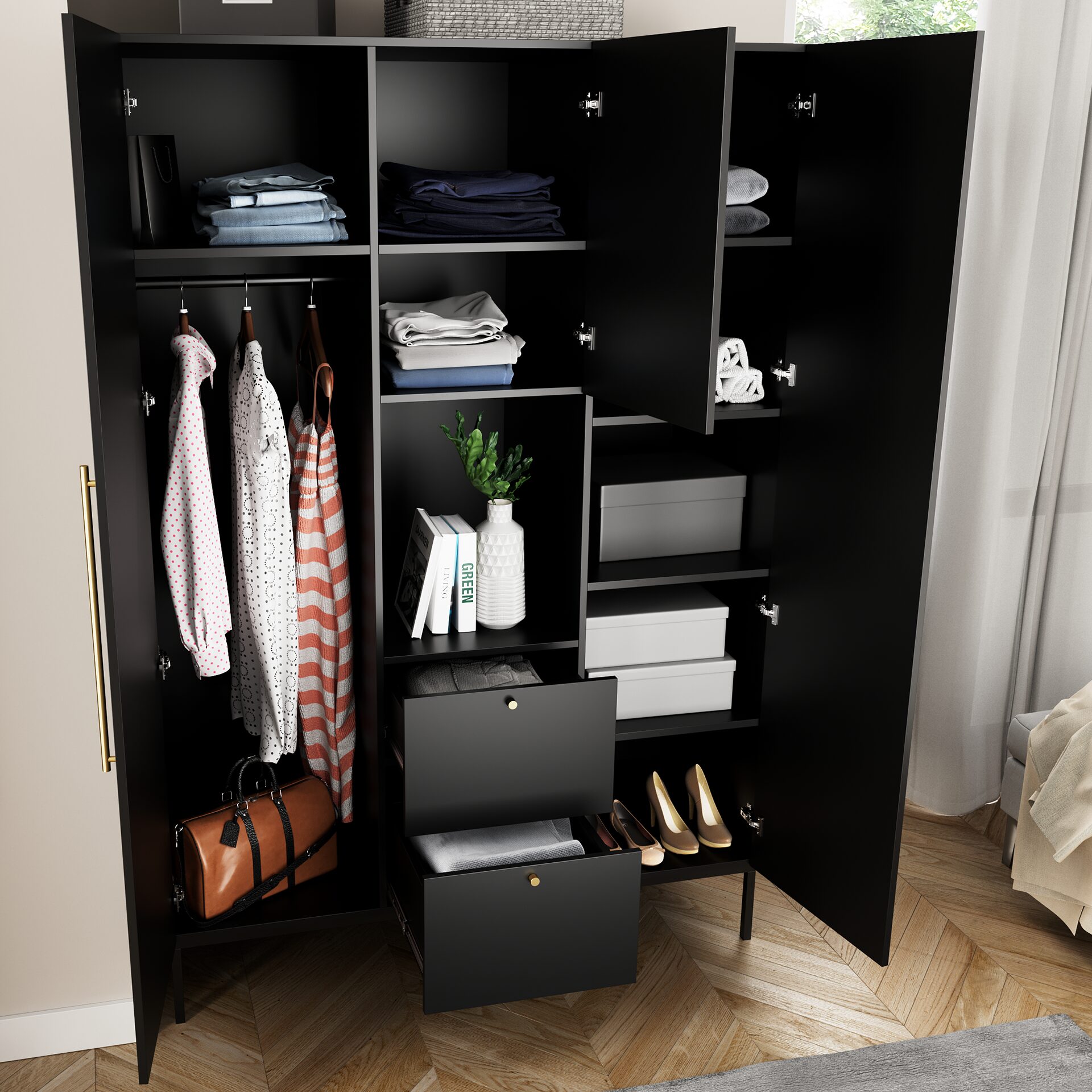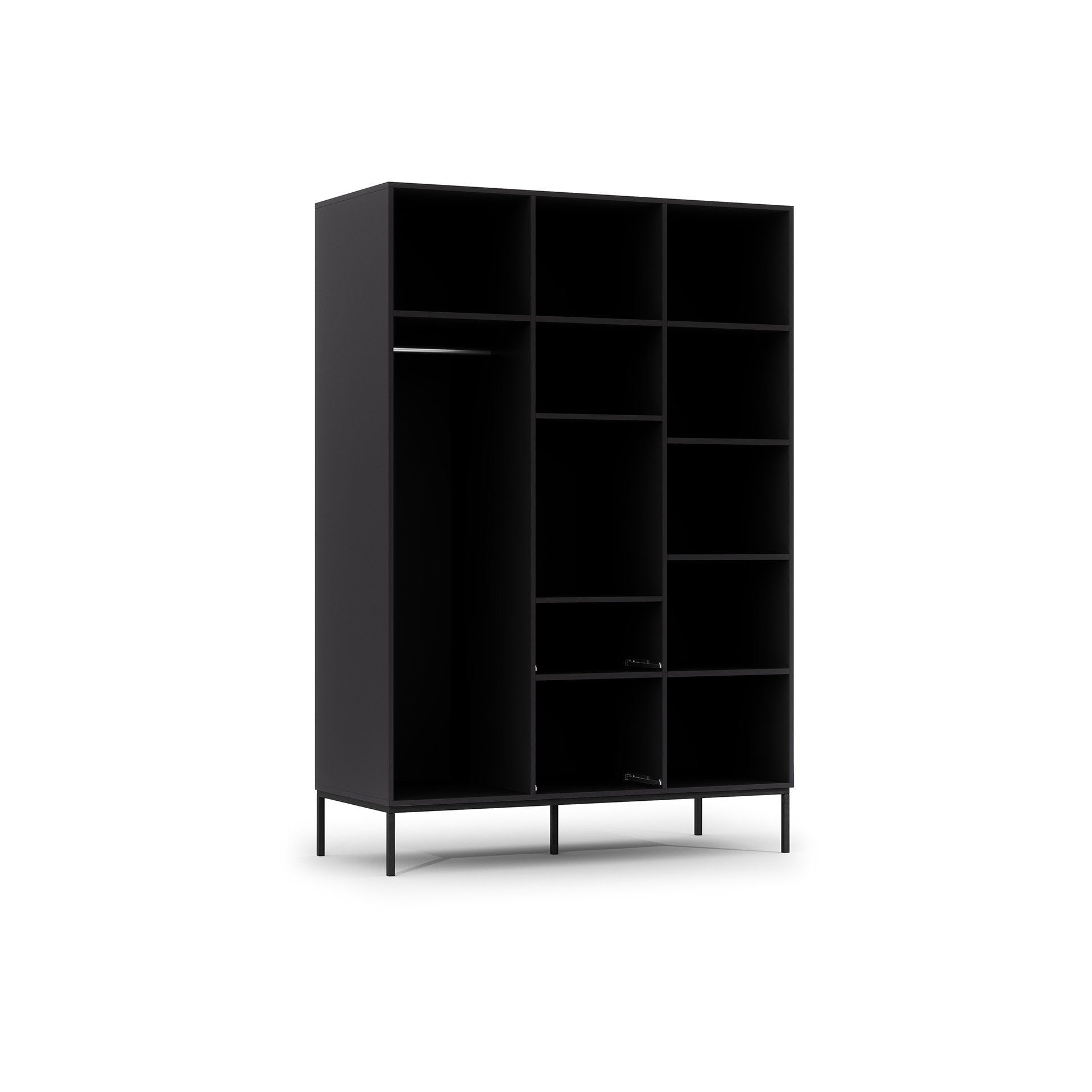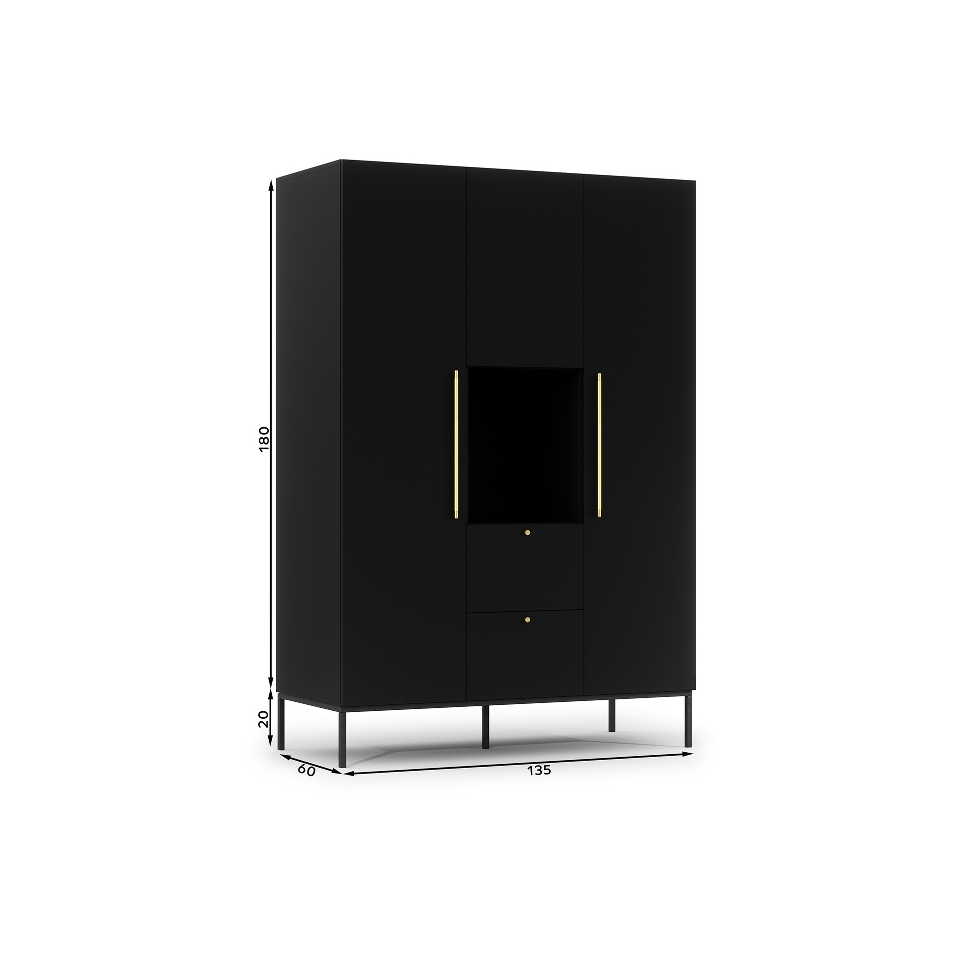 Didelė „Lanzzi“ spinta pasižymi puikiu dizainu, praktiškumu, funkcionalumu ir didele daiktų laikymo vieta. Spintelė padalinta į tris zonas. Pirmoji – pakaba, o viršuje – lentyna sulankstytiems drabužiams. Vidurinėje dalyje yra įduba, kurią galima naudoti kaip ekspozicijos vietą. Virš jų taip pat yra lentynos drabužiams. Du erdvūs stalčiai apačioje suteikia papildomos paslėptos daiktų laikymo vietos „Lanzzi“ spintoje. Dešinėje pusėje, už rakinamų durų, yra vienų durų spintelė su penkiomis lentynomis, kuriose yra erdvūs skyriai batams, kepurėms, marškiniams ir visiems sulankstytiems drabužiams. Išskirtinis „Lanzzi“ spintos bruožas – juodos metalinės kojelės, kurios pakelia spintelę 20 centimetrų nuo žemės. „Lanzzi“ spinta pagaminta iš storos, tvirtos laminuotos MDF plokštės ir yra dviejų spalvų. Galima rinktis iš dviejų spalvų: komplekte yra spintos karnizas; juodos spalvos milteliniu būdu dažytos plieninės kojelės; aukštis: 200 cm; gylis: 60 cm; plotis: 135 cm; svoris: 127 kg; rėmo spalva: juoda; medžiagos konfigūracija: matinė juoda + meniškas ąžuolas / matinė juoda + matinė juoda; medžiaga: MDF; kojos: metalinės; kojos aukštis: 20 cm; durelių skaičius: 3; lentynų skaičius: 9; atvirų lentynų skaičius: 1; stalčių skaičius: 2; pakabos skersinis: 1