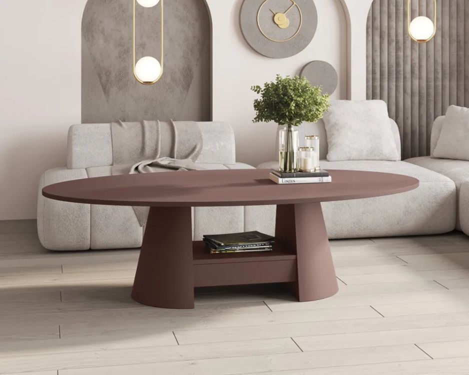 „Calabro“ kavos staliukas iš „Amore Colore“ kolekcijos – tai elegantiškas ir funkcionalus baldas, žavintis moderniu dizainu ir aukštos kokybės meistriškumu. Ovalus stalviršis pagamintas iš aksominio, matinio akrilo, sodraus bordo atspalvio, suteikiančio jam subtilios prabangos ir modernaus elegancijos. Kavos staliuko paviršius ne tik malonus liesti, bet ir atsparus įbrėžimams bei aukštai temperatūrai iki 100 °C, todėl puikiai tinka kasdieniam naudojimui. Dėl novatoriškos apsaugos nuo pirštų atspaudų dangos kavos staliuko paviršius yra atsparus pirštų atspaudams, todėl jį lengva prižiūrėti nepriekaištingos būklės.