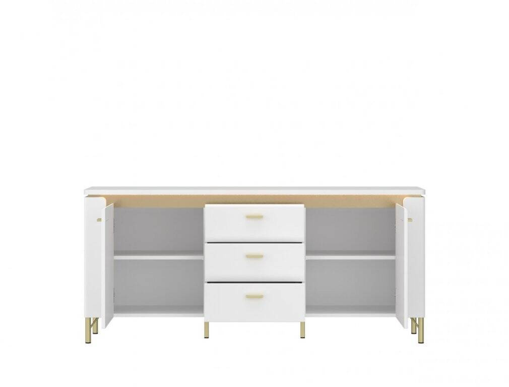 Papildomas privalumas – modernus LED apšvietimas, kuris sukuria unikalų vizualinį efektą ir subtiliai apšviečia komodos vidų. Baltos blizgios spalvos ir LED apšvietimo derinys sukuria modernią, prabangią atmosferą, kuri pradžiugins kiekvieną. Komodos matmenys – 155,3 cm pločio, 70 cm aukščio ir 40 cm gylio – daro ją idealiu sprendimu erdvioms svetainėms, kartu siūlydama ir daug vietos daiktams susidėti.