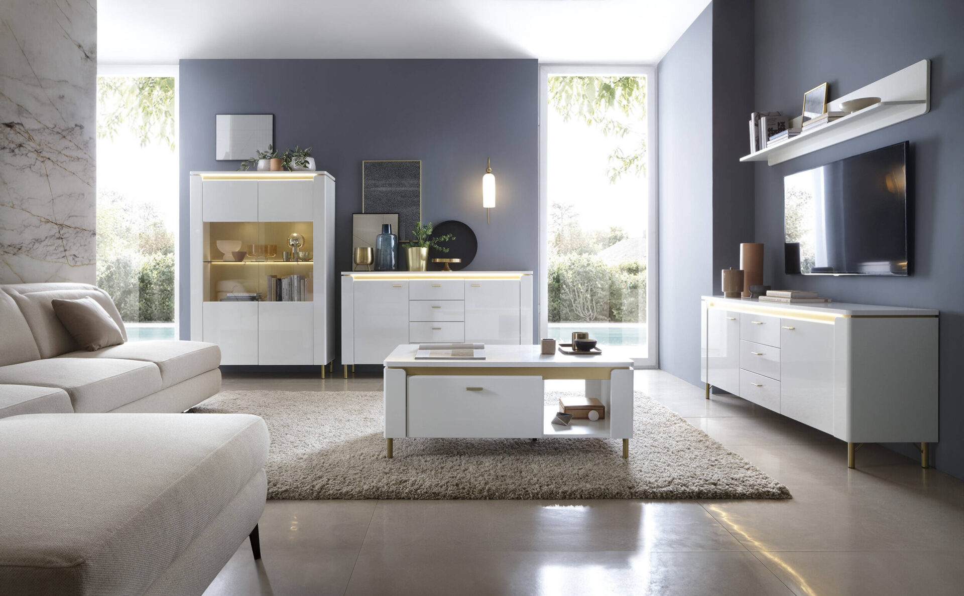 Lazio LAZF01 – 2D3S televizoriaus spintelė su LED apšvietimu, Alpių balta/blizgi balta/auksinė
